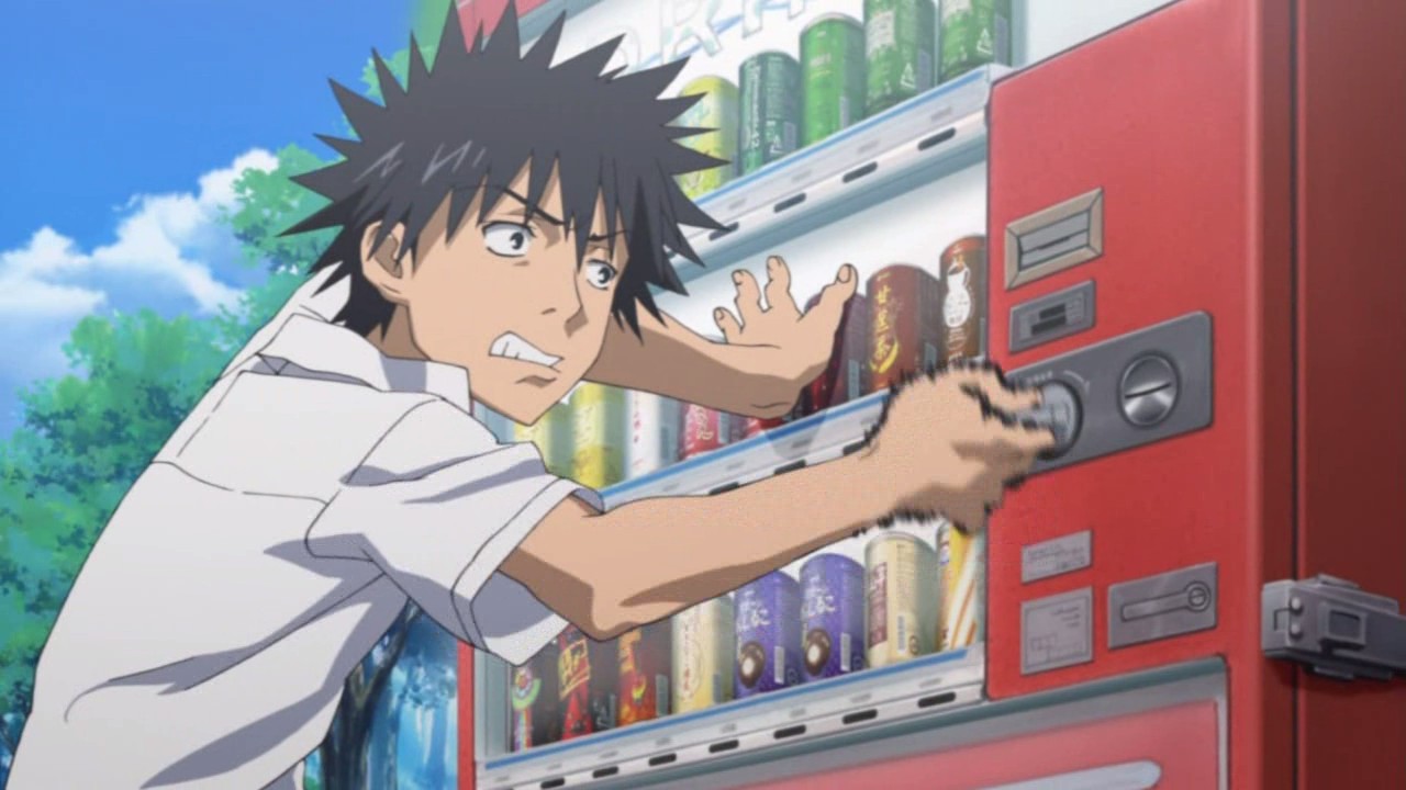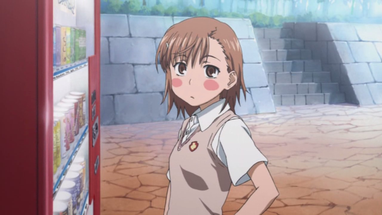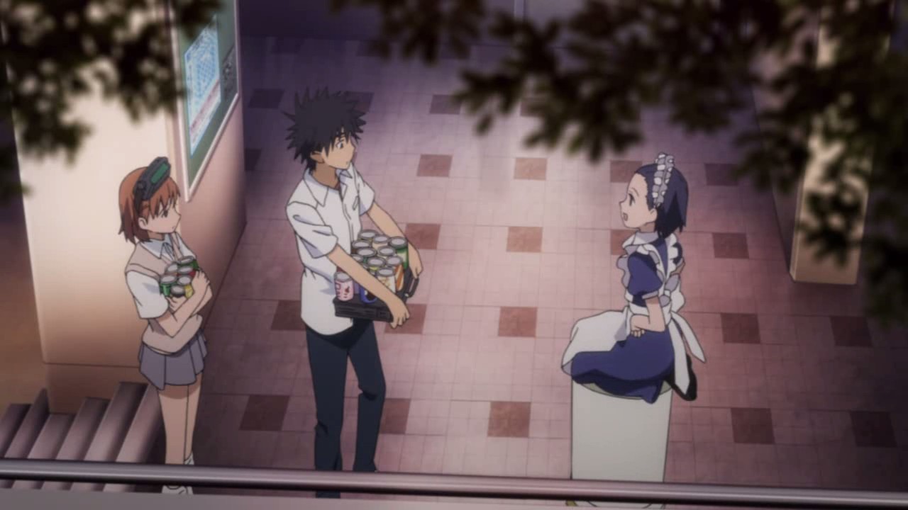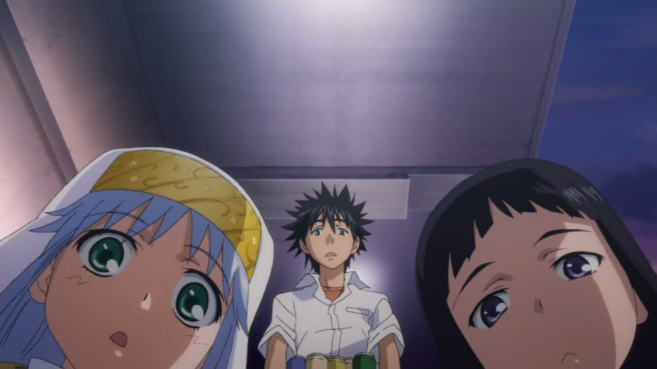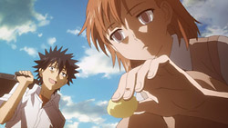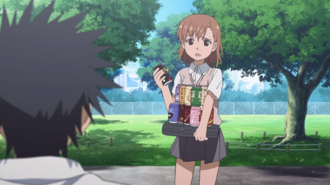 On a rooftop one night, a girl with a sniper rifle targets a guy who just came out of a store. She calls her target Accelerator, but when she fires, the gun explodes, and she’s thrown back with a severe arm injury. The girl who resembles Misaka Mikoto now tries to flee, but she’s cornered by the same guy she tried to shoot. Sometime later, Touma is heading home from school when he stops off to get a drink from a vending machine. He sticks a 2000 yen bill into it, and much to his dismay, the machine eats the money without giving him a drink or change. Mikoto then appears and kicks the machine to get it to spit out a drink, and she laughs when she finds out how the machine ate Touma’s money. She offers to get it back for him and uses her electric power to force the machine to spit out multiple cans, but Touma doesn’t want to be an accessory to a crime and tries to run away. Mikoto gathers up all the cans anyway and tracks him down, and Touma has no choice but to accept them. In the ensuing conversation, he learns that he had defeated her, but because he doesn’t have his memories, he has no idea in what.