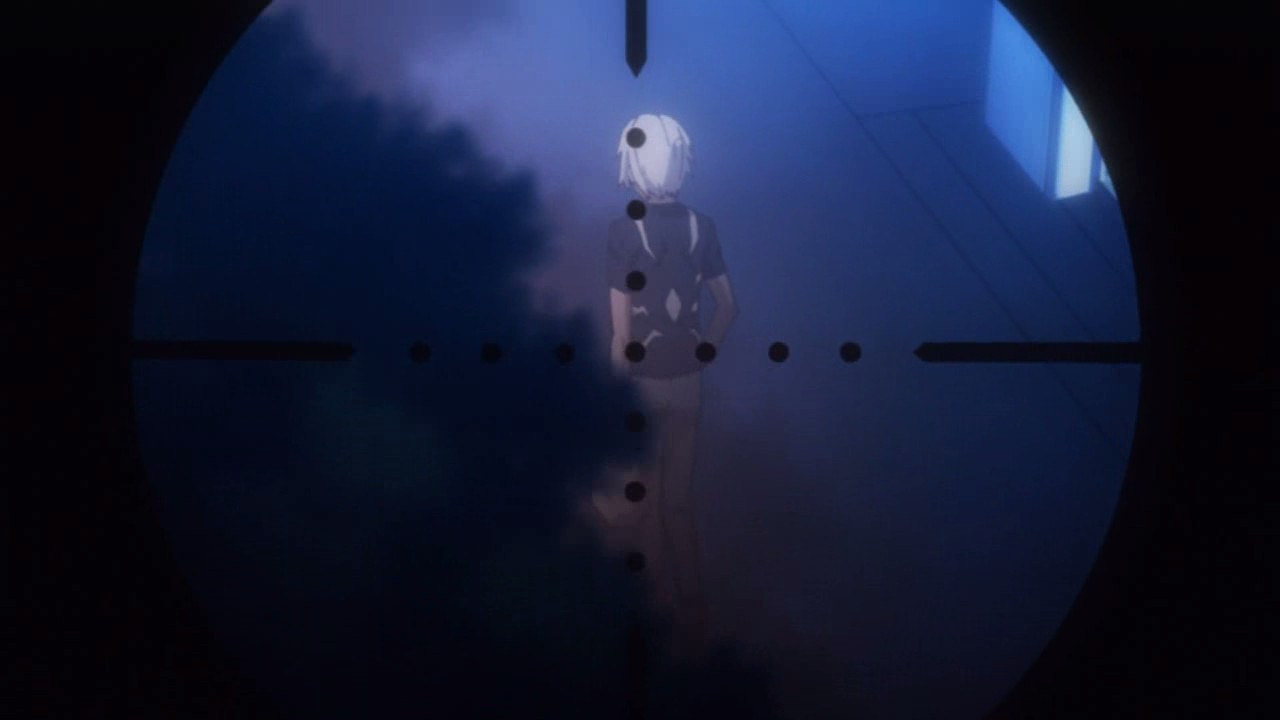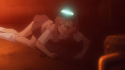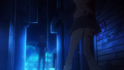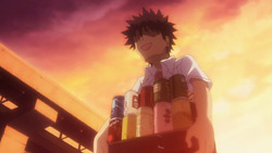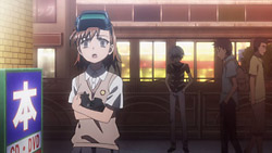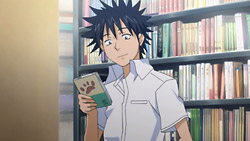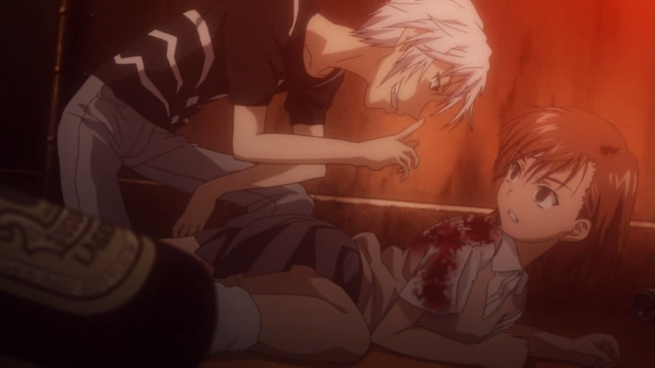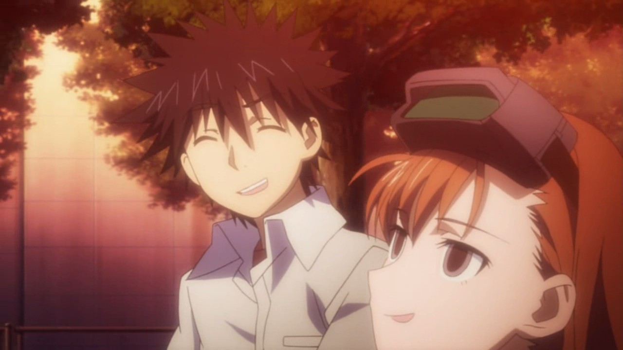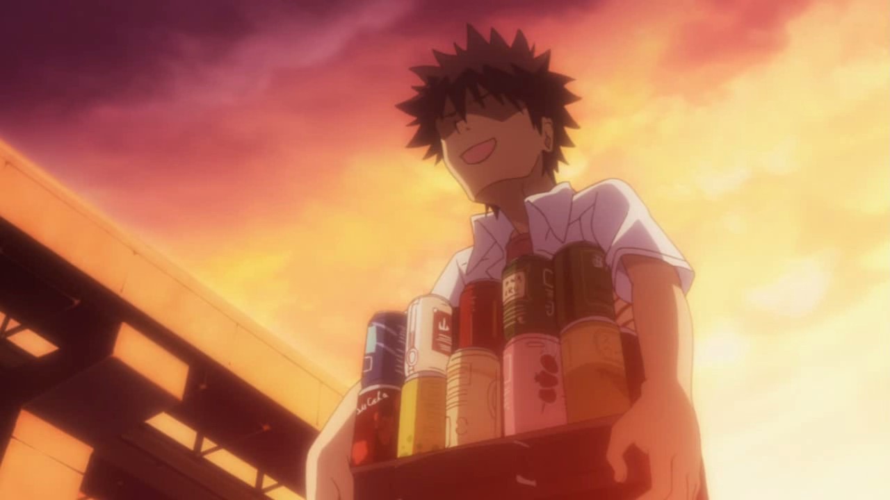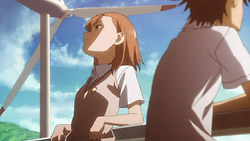 On a rooftop one night, a girl with a sniper rifle targets a guy who just came out of a store. She calls her target Accelerator, but when she fires, the gun explodes, and she’s thrown back with a severe arm injury. The girl who resembles Misaka Mikoto now tries to flee, but she’s cornered by the same guy she tried to shoot. Sometime later, Touma is heading home from school when he stops off to get a drink from a vending machine. He sticks a 2000 yen bill into it, and much to his dismay, the machine eats the money without giving him a drink or change. Mikoto then appears and kicks the machine to get it to spit out a drink, and she laughs when she finds out how the machine ate Touma’s money. She offers to get it back for him and uses her electric power to force the machine to spit out multiple cans, but Touma doesn’t want to be an accessory to a crime and tries to run away. Mikoto gathers up all the cans anyway and tracks him down, and Touma has no choice but to accept them. In the ensuing conversation, he learns that he had defeated her, but because he doesn’t have his memories, he has no idea in what.