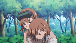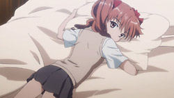 Mikoto is caught off guard when Kuroko finds her sitting with Touma. Kuroko assumes that Mikoto is meeting secretly with Touma, but Mikoto angrily denies that Touma is her boyfriend. When Mikoto tries to strike Kuroko with her lightning, Kuroko teleports away. Another girl then appears, this one a spitting image of Mikoto, and she identifies herself as Mikoto’s little sister and refers to herself as simply Misaka. Frustrated, Mikoto leads Misaka away despite Misaka’s objections. Touma is left to go home by himself with all the canned drinks, and along the way, he trips on a ball. While lying on the ground, he’s approached by a Misaka and is able to identify her after catching a glimpse of her panties since he noticed earlier that Mikoto had been wearing shorts under her skirt. Misaka carrying with her a pair of military goggles and explains to Touma that, unlike her sister, she doesn’t have the skill to see electron beams and magnetic field lines, so she needs a device to visualize them.