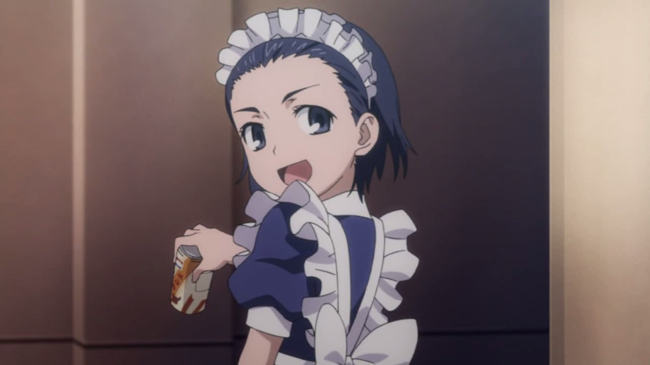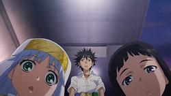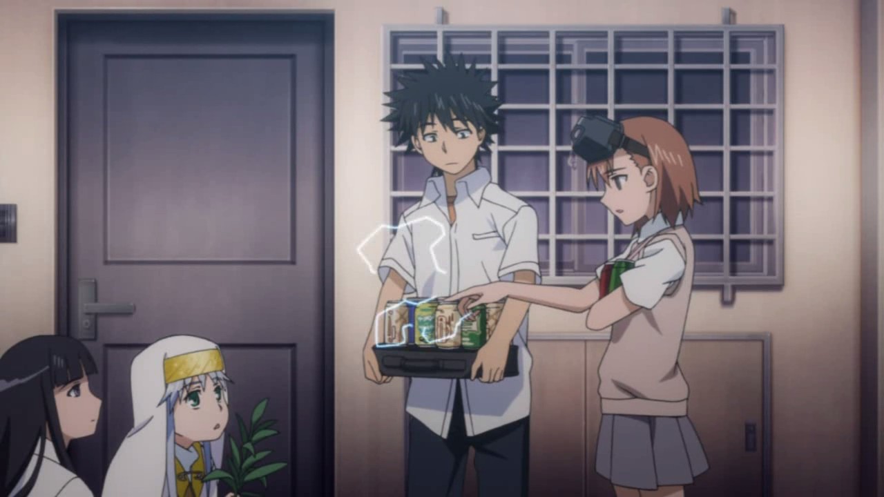 Misaka helps Touma carry the canned drinks back home, and at the apartment building, they run into the stepsister of his classmate Tsuchimikado. Her name is Maika, and she goes to a maid school. Upstairs, the two find Index and Himegami gathered around Sphinx because the cat is covered in fleas. Index’s idea is to use a sage plant to get rid of them while Himegami wants to use what she calls a magical spray, but the ultimate solution comes from Misaka who uses her electricity to fry only the fleas. After doing this and placing the drinks on the ground, Misaka leaves. The next day while in class, Touma learns from Komoe that Mikoto is ranked third in the city and was originally a Level 1 who worked really hard to get to Level 5. When he runs into her again that afternoon, she comments on how she hates the blimp that flies around announcing the topic of the day because it means that man is following policies decided by machines.