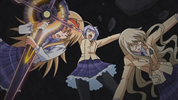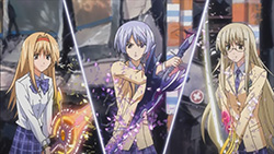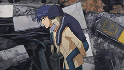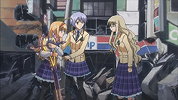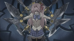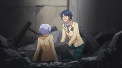 Wandering through the wreckage with Yua, Ayase runs into Nanami and recalls how Rimi tried to carry the burden of getting rid of Noah II herself without awakening Takumi, something she didn’t agree with. Having fallen into a large hole, the three of them are saved by Takumi sometime later with his new found powers. Takumi then reunites Nanami with her real brother, causing her to recall all the memories of Shogun that were forgotten. Shogun tells Nanami to support Takumi though, since they’re one in the same, so she and the others decide to help Takumi destroy Noah II. Elsewhere, Sena and Kozupii run into Sena’s father, who feels that being killed by his daughter will atone for his sins. With little explanation about Sena’s mother and younger sister, he ends up protecting Sena from a delusional attack/gunshot by Suwa. With the two of them being attacked by delusions now, Takumi soon arrives to save them both, and even reverses one of Suwa’s delusional attacks. Afterwards, Sena realizes that she didn’t really want to see her father dead, and in tears, asks Takumi to destroy Noah II. Takumi agrees to do so, but for his own reasons — to save Rimi.