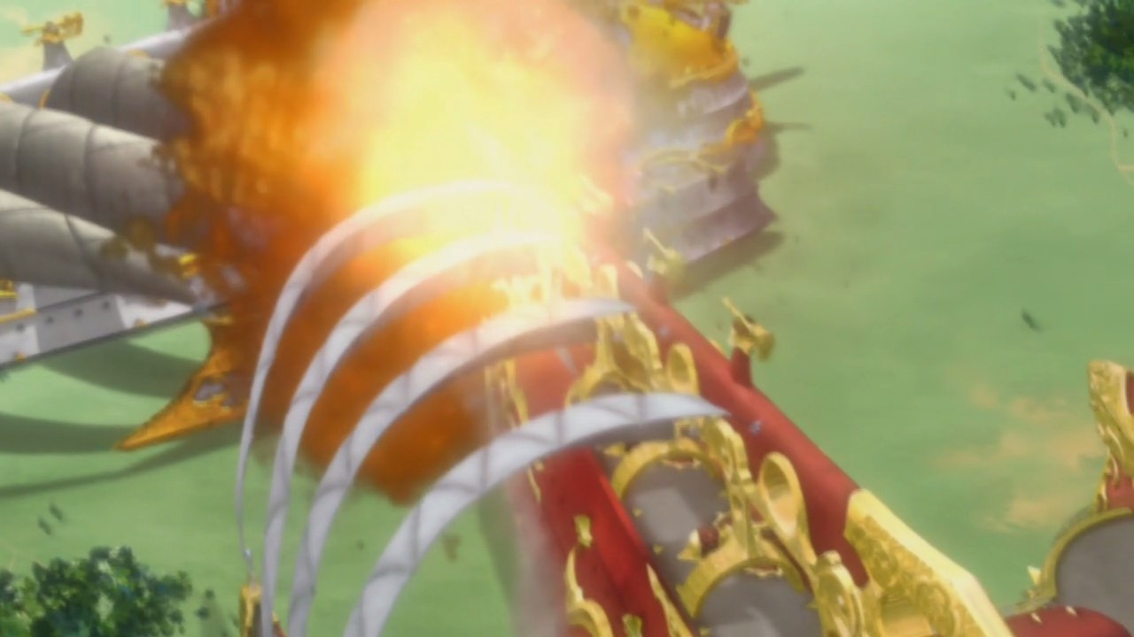 The airship – called the Albiore – is the help that Peony sent, and its pilot is a girl named Noelle. They can’t do anything to prevent the chunk of St. Binah from falling down into Qliphoth, but they do manage to catch up to it while it’s falling, and they save McGovern and the others. Luke is desperate to find a way to save the city as well, but Jade yells some sense into him, and the bigger problem is that the war between the two powers has started. Tear realizes that this is what Van was after because he knew where the battle would take place and could take out both armies at once since the Sephiroth Tree under the land was gone. The group decides to split up to convince the two sides to stop fighting, but Jade’s group is unable to convince Peony, and Luke and Natalia’s group gets accused of being traitorous by Mohs.