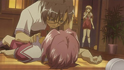 With Mio wounded, Yoshika tries desperately to heal her, only to end up passing out from overusing her powers.