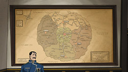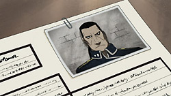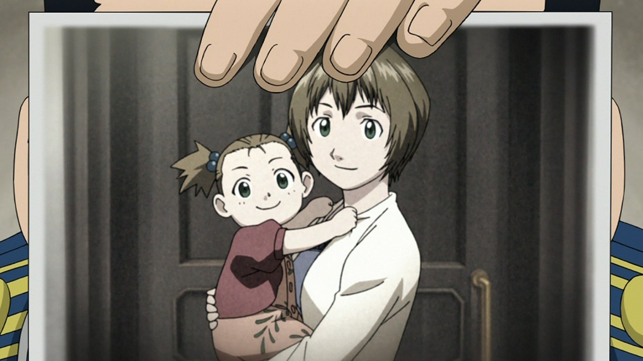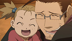 When the regenade Ice Alchemist runs amok inside Central, Führer King Bradley puts Roy Mustang in charge of his capture. Edward and Alphonse Elric are taking part in the operation as well, and they manage to corner the guy. Edward’s automail right arm and the fact that he doesn’t use a transmutation circle make the Ice Alchemist realize that Edward is the Fullmetal Alchemist. Regardless, the two manage to capture the Ice Alchemist, but he promptly escapes from the soldiers who come to take him away. The two brothers then return to headquarters where they get lectured by Mustang. The Flame Alchemist explains that the Ice Alchemist is Isaac McDougall, a former state alchemist who participated in the Ishbal extermination war but had given up his state alchemist title afterward and had joined an anti-establishment movement. Mustang prioritizes his capture but knows that they might have to kill him, and that’s something Ed doesn’t want to do. Their conversation is interrupted by the arrival of Maes Hughes who meets Ed and Al for the first time, and he invites them to stay over at his house. This gives Hughes the chance to show off his wife Gracia and daughter Elicia, and the family treats the brothers to dinner. Not wanting to reveal the reason why Al can’t eat, Ed claims that Al is in the middle of alchemist training.