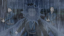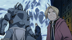 Isaac then forms a giant block of ice and rides on top of it, and Ed and Al realize that Isaac is trying to bury headquarters in ice. Ed thus decides to go after Isaac and has Armstrong take care of the transmutation circles that Isaac set up. The two brothers climb onto the block of ice and fight Isaac, and when Isaac tries to blow Al’s head off, he realizes that he’s fighting an empty suit of armor upon which a soul was affixed. This combined with how Ed lost his real arm leads Isaac to figure out that the two brothers committed the taboo of human transmutation. This really angers Ed, and together with Al, he beats up on their opponent. Isaac, however, still has a few tricks up his sleeves, and he freezes his blood to stab Ed in the shoulder. This gives him a chance to escape again and make his way into a dark alley, but he finds Bradley waiting there. Isaac tries to take down Bradley with a spear of ice, but Bradley kills Isaac in one quick motion. By the time Ed and Al arrive on the scene, everything is already over, and the two still don’t know if a Philosopher’s Stone was involved. Unbeknownst to them, the Homunculus Lust is on the phone with someone about Isaac’s death. She thinks that Isaac used the Philosopher’s Stone too much, and she reports that things in Lior are going well. With Gluttony nearby, she feels that it will start soon.