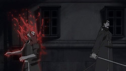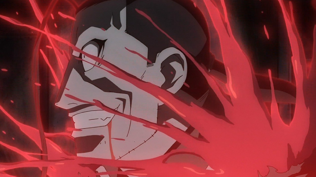 Meanwhile, at Central Prison, Isaac has gone to see Kimblee, the Crimson Alchemist, to convince him to join forces to overthrow Bradley and the military. Isaac points to how Kimblee had killed high ranking military officials, but Kimblee claims that he just killed them because he wanted to, so Isaac leaves him there. Back at Hughes’s home, he’s up late thinking about how the Elric brothers are seen as dogs of the army at such a young age. Ed and Al, on the other hand, are talking about dinner and how Al wants to get his original body back. The search for Isaac continues the next day until Alex Louis Armstrong is able to find him in an alley, and the commotion attracts Ed and Al. Isaac manages to escape though, and he evades capture yet again when he gets cornered by Mustang and some troops. He returns to the same alley later that night, but he’s found again by Ed and Al. Instead of running away this time, he activates multiple red-hued transmutation reactions at once across the city, causing the brothers to think of the Philosopher’s Stone. Isaac feels that Ed would understand what he’s trying to do if Ed knew what the country was trying to do, but what Ed cares about now is how Isaac might have a Philosopher’s Stone.