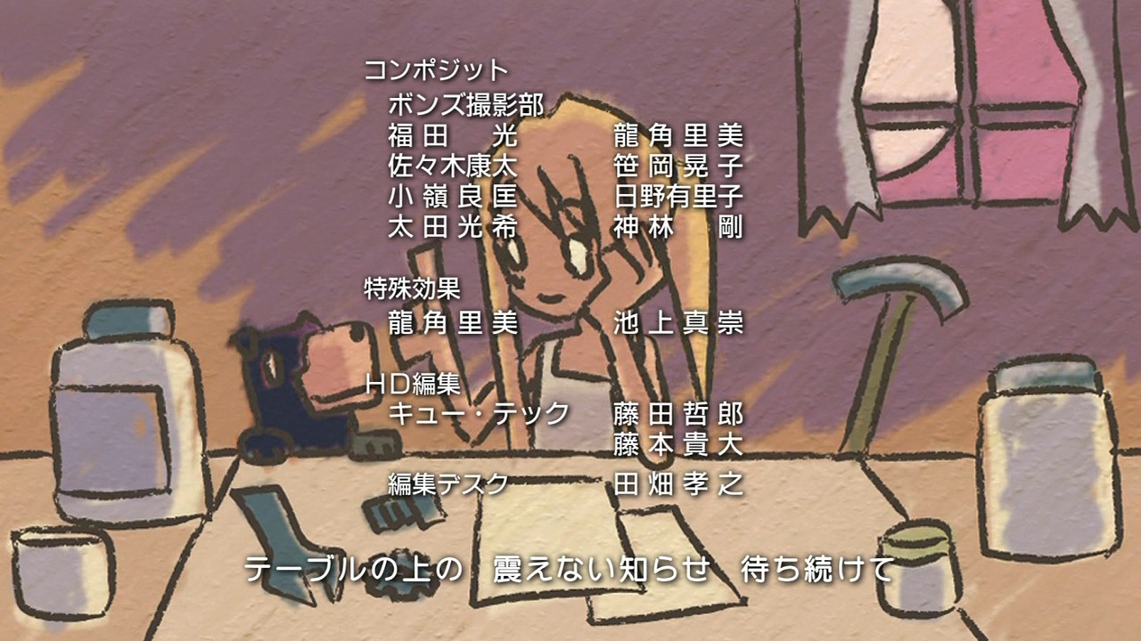 I really liked the music from the original FMA and had hoped that the new series could feature some good songs as well. Fortunately, YUI and SID don’t disappoint. Both songs are pretty good – Uso is a bit more catchy but I’m liking again more the more I hear it. As for the animation sequences, the OP features mostly characters shots (and this being FMA, there are a lot of characters) plus a couple of action sequences, and it was cool to see that certain parts had the character lips matching up to the lyrics. The ED meanwhile is an amusing hand-drawn style, though I didn’t really think that it matched the song. In any case, the full versions of both songs are already out there if you need some instant gratification.