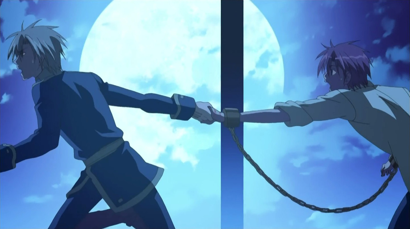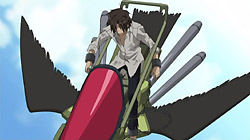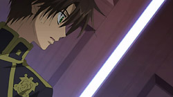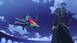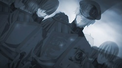 It all comes to a head the following day when the sound of a necklace leads him to overhear Ayanami talking to his men about something called the Eye of Michael. It triggers a memory inside of Teito of the man from his dreams – his father – being killed by Ayanami. This drives Teito into a rage and he tries to attack Ayanami, but he’s quickly stopped and locked up by Ayanami’s men. Mikage hears about this later and goes to help his friend, but Teito has already broken out on his own by that point. Teito doesn’t want to get Mikage involved, but Mikage insists on helping him get away. When the two are cornered by some guards on a balcony, Teito pretends that Mikage is his hostage and pushes his friend into the guards so that he can jump onto a vehicle below. As Teito prepares to fly off, he comes face-to-face with Ayanami for a moment, and although Ayanami manages to shoot and injure him, Teito is still able to escape. Teito’s vehicle flies away from the city, and his path just happens to cross that of three guys.