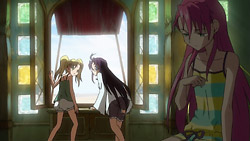 Speaking of random voice actors tidbits: I find it amusing that Citron (Ranka’s VA from Macross F) seems to have taken an interest in Iceman (Alto’s VA from same show) meanwhile the preview shows Rouge (Nagi’s VA from Kannagi) is kissing Dan (Jin’s VA from the same). Somehow I wouldn’t put it past this show to sneak a reference in there.