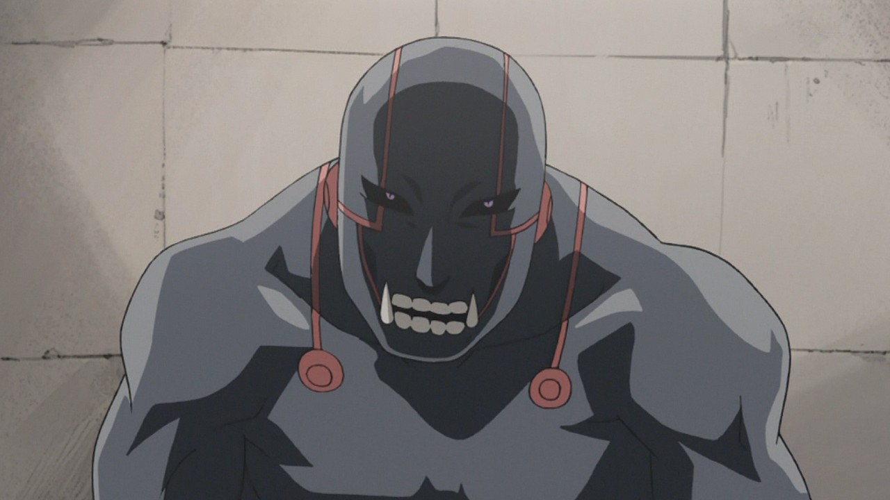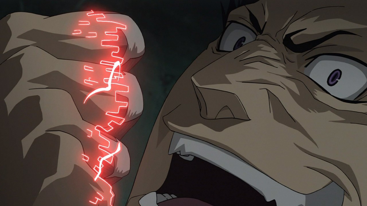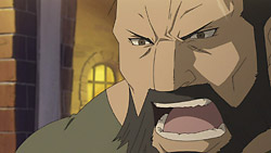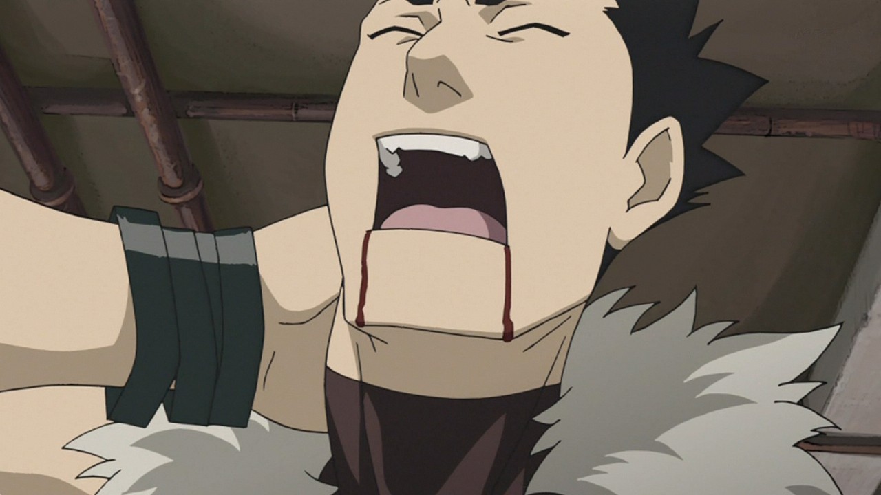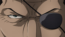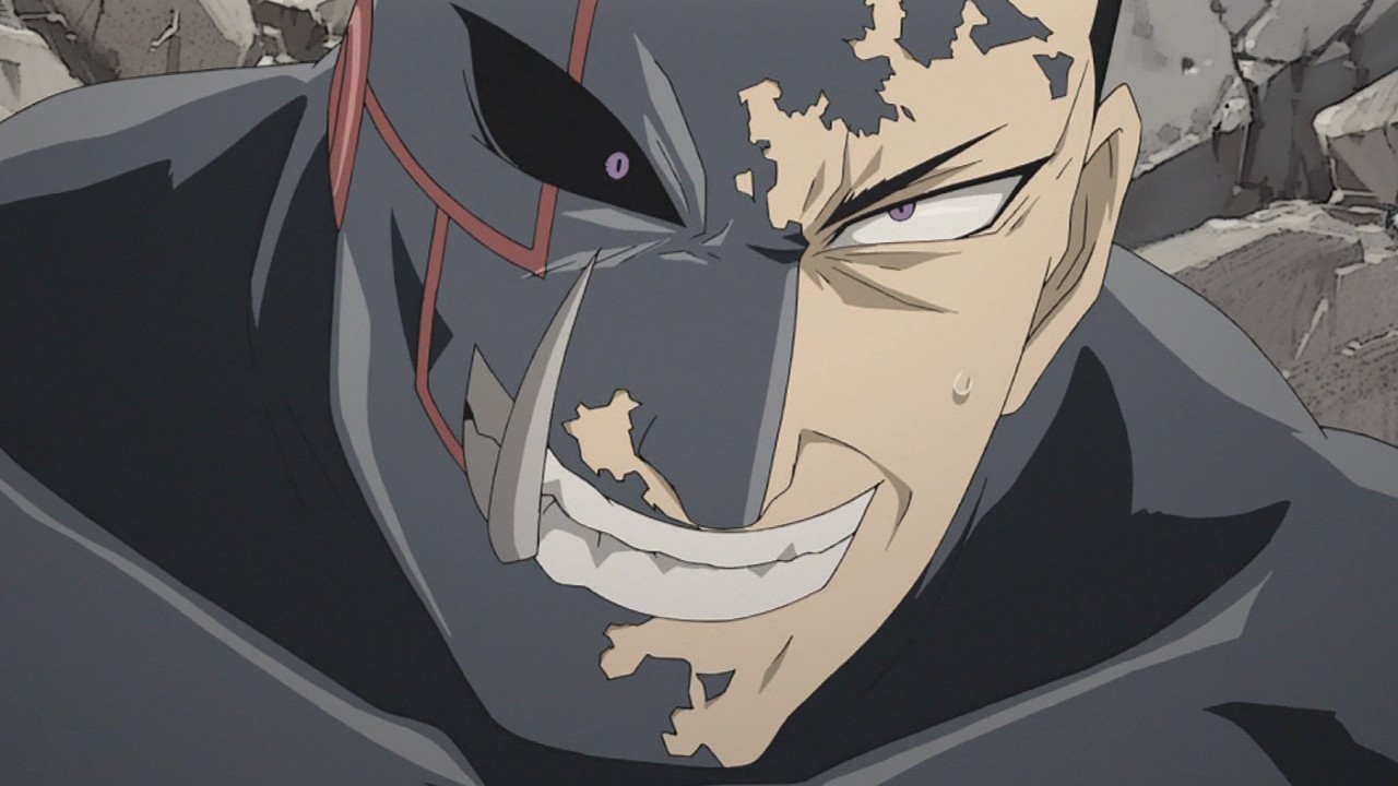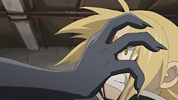 Scar meanwhile is still recovering from his injuries and meets with a village leader who urges him not to continue seeking vengeance. Their conversation is interrupted by some thugs who are after the bounty on Scar, but Scar easily takes care of them. He ultimately decides to leave the settlement because he feels that he can no longer turn back. Back in Dublith, Al gets tossed a message on a piece of paper while he’s alone, and it directs him to a place called Devil’s Nest where several people are waiting. They claim to know about his secret, and when Al decides that it’s better to use force against them, they manage to restrain him by inserting the female of the group into his armor. The leader of the group then appears and introduces them as chimeras who were each combined with a different animal by the military. He himself is not a chimera though and reveals that he’s instead Greed, a Homunculus.