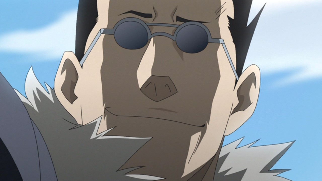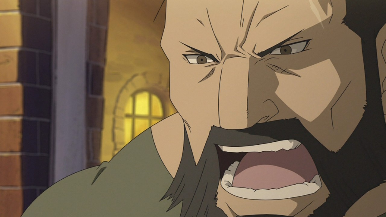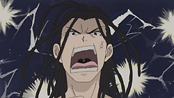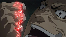 So, cons: Greed is better than stupid ice alchemist and Rose and Rush Valley baby arcs. I really wouldn’t have minded all those being cut out and spending more on this guy (ice alchemist was filler, stupid Roze and stupid Liore could be introduced a la Yoki, as a passing reference, and Rush Valley isn’t important at all). More chimera stuff would have been awesome. I hoped that, when we reached Greed, they’d slow down, but doesn’t look like it. Also, I’m remembering something about Bradley being here in the manga with a hawaian shirt (what was he doing here? more importantly, why the hell do I remember the hawain shirt and not all this?XD), and that would have been awesome. This part was more amusing, and Greed more entertaining and kind of “happy-go-lucky bad boy” that makes you root for him. Also, too many over-the-top agressive declarations in this ep