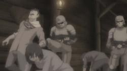 At roughly the same time, Welkin’s group and Zaka’s group launch their attacks on their respective targets. Zaka’s group is liberating the concentration camp, but Zaka himself initially has trouble communicating with Rosie using hand signals. Regardless, they are able to kill the guards and free everyone. Rosie finds the conditions the Darcsen had to live under atrocious, and Zaka uses it to emphasize to her how much his people suffered. Their group then moves on to their next target, the train tracks, and they lay some explosives. Welkin’s group meanwhile attracts the attention of the Imperials, so Gregor sends out the tanks. Unbeknownst to the Imperials, Isara and Lamar have stolen one of the tanks, and they use it to destroy the others tanks threatening Welkin’s group. With this helping them, Welkin has his men move forward, but what they don’t realize until almost too late is that there’s a survivor of one of the destroyed tanks. That soldier targets Alicia, and Faldio tackles her out of harm’s way just in time to save her. Despite shooting the enemy soldier afterward, Welkin can only watch in silence as Faldio helps up an embarrassed Alicia.