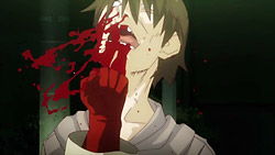 After ending his call with Tsubasa, Koyomi thinks about how he wants Hitagi to regain what she lost and threw away. He also remembers that he forgot to take with him the payment that Hitagi wanted him to give to Oshino for his services. His thoughts, however, are interrupted when he notices a cloaked figure behind him, and this person suddenly punches him in the face. Koyomi is still reeling from the first hit when the person delivers several more, and he ends up collapsing with a bloodied face. He notices though that there are bandages hanging out from this person’s sleeves, and he’s reminded of Suruga’s bandaged left hand. The person then disappears however, and the next thing Koyomi knows, Hitagi is standing over him with the money he forgot.