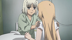 After a nightmare about Maria shattering into pieces, Canaan wakes up to find Maria standing over her hospital bed. Both are glad that the other is actually okay, but Canaan is bothered by how she can’t sense people’s colors anymore. Minoru meanwhile is on the phone with Maria’s father talking about survivors of the Ua Virus from the village that disappeared. Minoru suspects that Alphard’s organization somehow got the anti-virus and are using the village survivors, meaning that what happened at the village was actually human experimentation. In response to this, Maria’s father thinks that there’d be clues in the village. Meanwhile, at Santana’s shop, Hakko has a flashback to how she watched a child die from the Ua Virus while in a facility somewhere. She’s only able to find solace from these memories by drinking and kissing Santana.