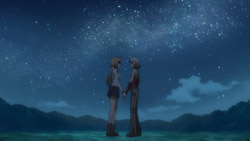 When they stop for the night, Maria admires the stars with Canaan and tells her about the encounter with Alphard. She then segues into how she used to feel empty and how Canaan shined, and Maria had wanted to be at Canaan’s side so that she herself could one day shine. She wants Canaan to always be with her, and the two hold hands. Later that night, after everyone else has fallen asleep, Hakko tries to strangle Canaan, but Canaan is able to fight her off. Hakko then runs away, so Canaan chases after her, and Santana soon wakes up and notices that they’re missing. Santana’s yelling for Hakko wakes Minoru, and Santana ends up revealing that Hakko hasn’t forgiven him for erasing her village. Canaan meanwhile catches up with Hakko and questions if Hakko hates her, but she can’t figure out Hakko’s true feelings without being able to see the colors. Hakko eventually gets back up and silently tells Canaan that it’s her fault, but she goes back to the car. The next morning, the only one unaware of what happened is Maria. Everyone’s attention though is soon turned towards a long figure biking down the road: Yunyun.