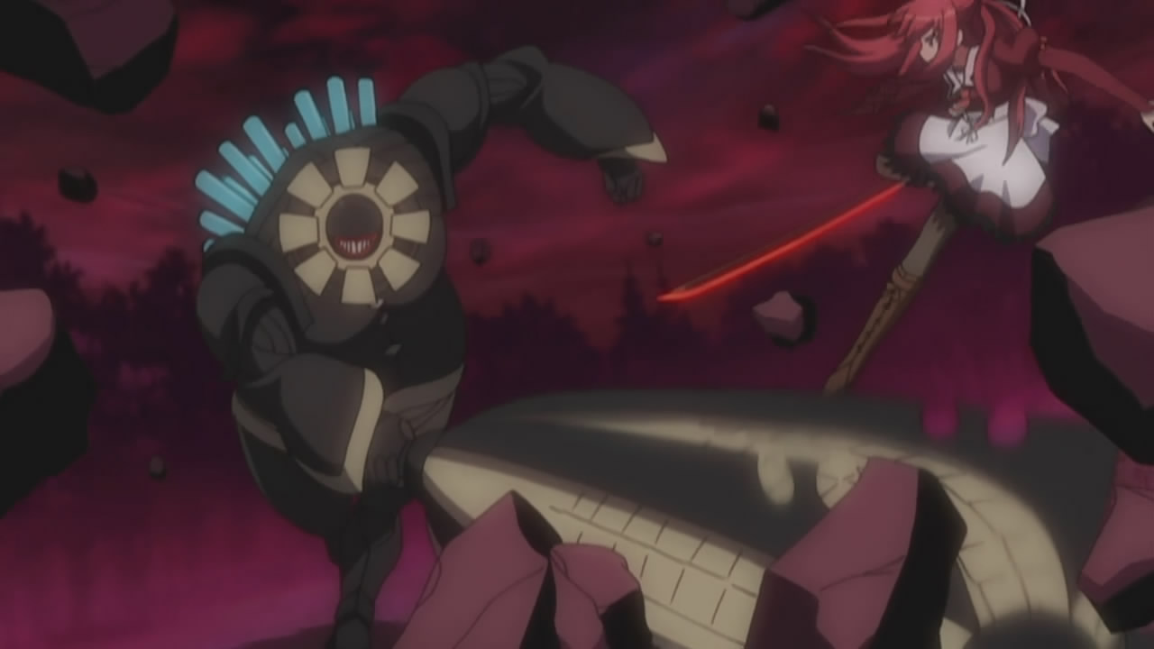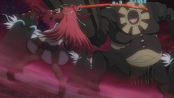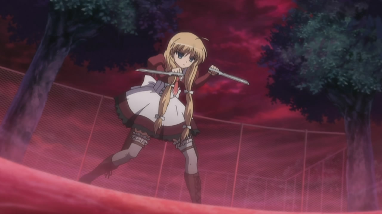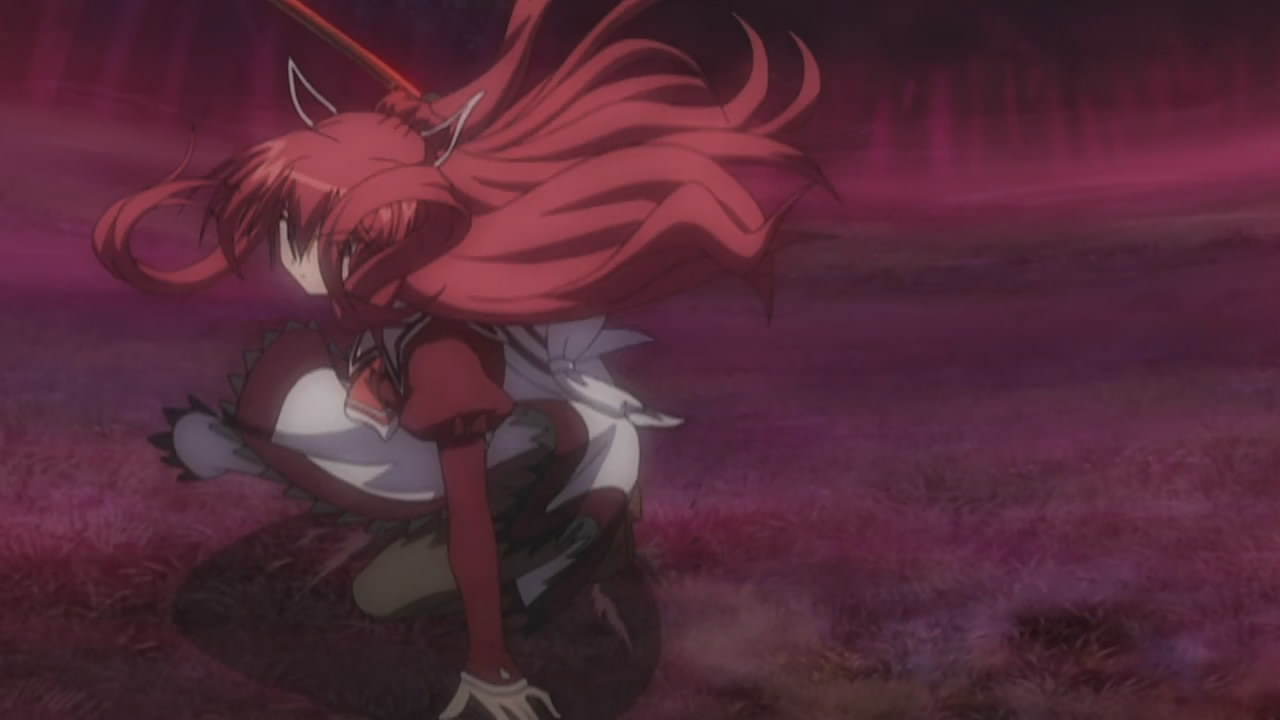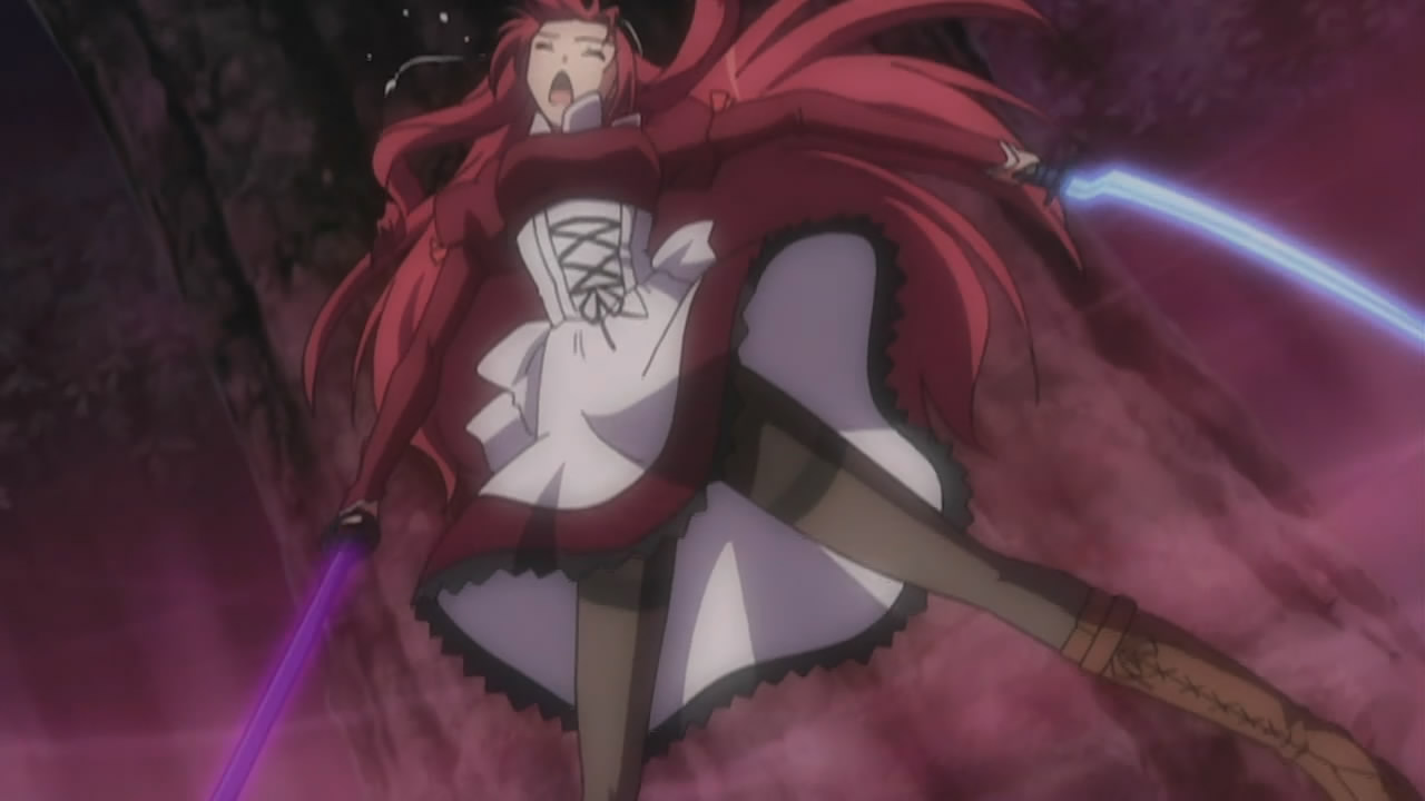 After 3 episodes I still think the school uniform looks stupid, I just can’t seem to get my head round it. That H-game character designer must really have had a strong maid fetish to dress up students like that. :PAs for episode itself imho it is a mixed bag. The first half was angsty, slow, and fairly boring. In fact I discovered that my attention kept wandering off and I had to rewind and rewatch some segments. However once the red night starts it is much better, but then again it is difficult to make watching pretty redheads with big flaming swords fighting monsters boring. 😀