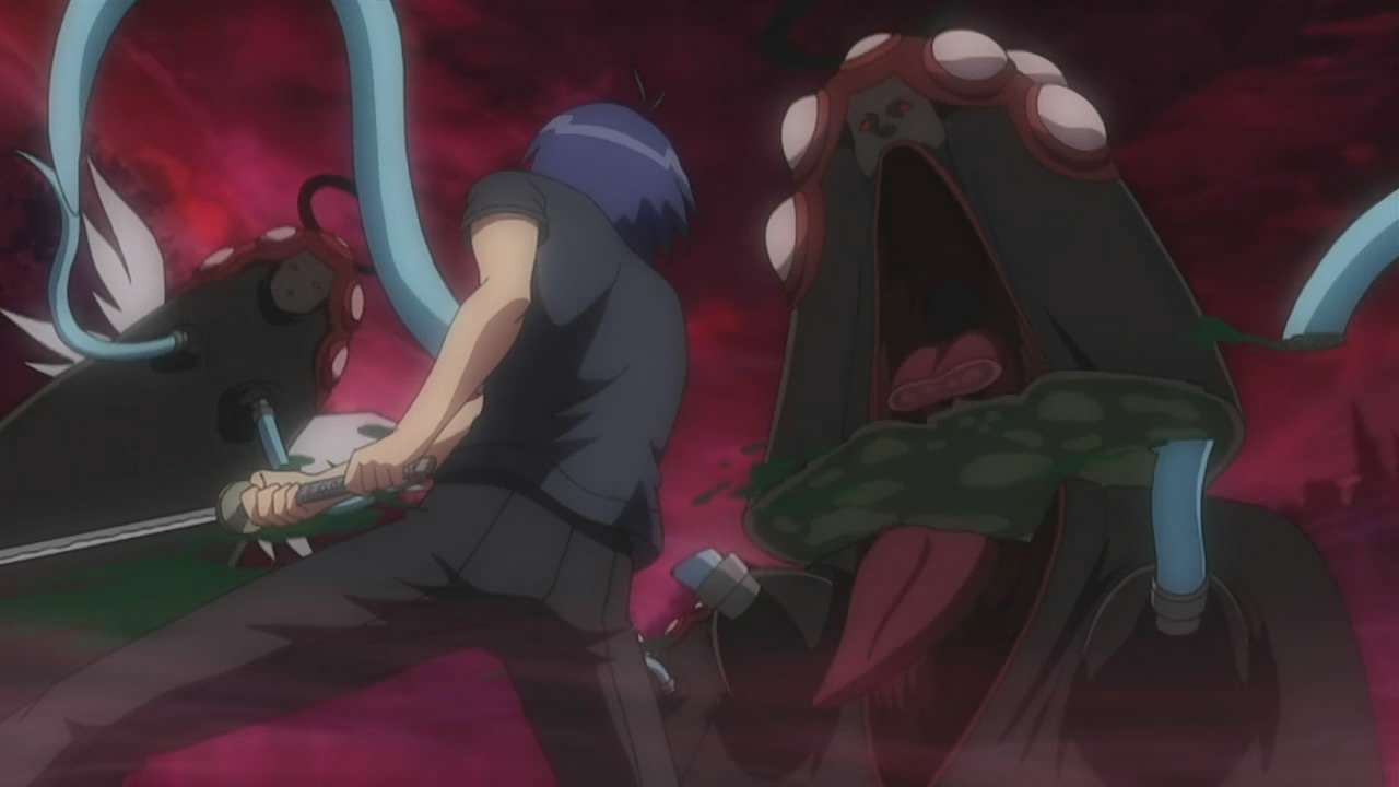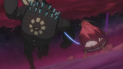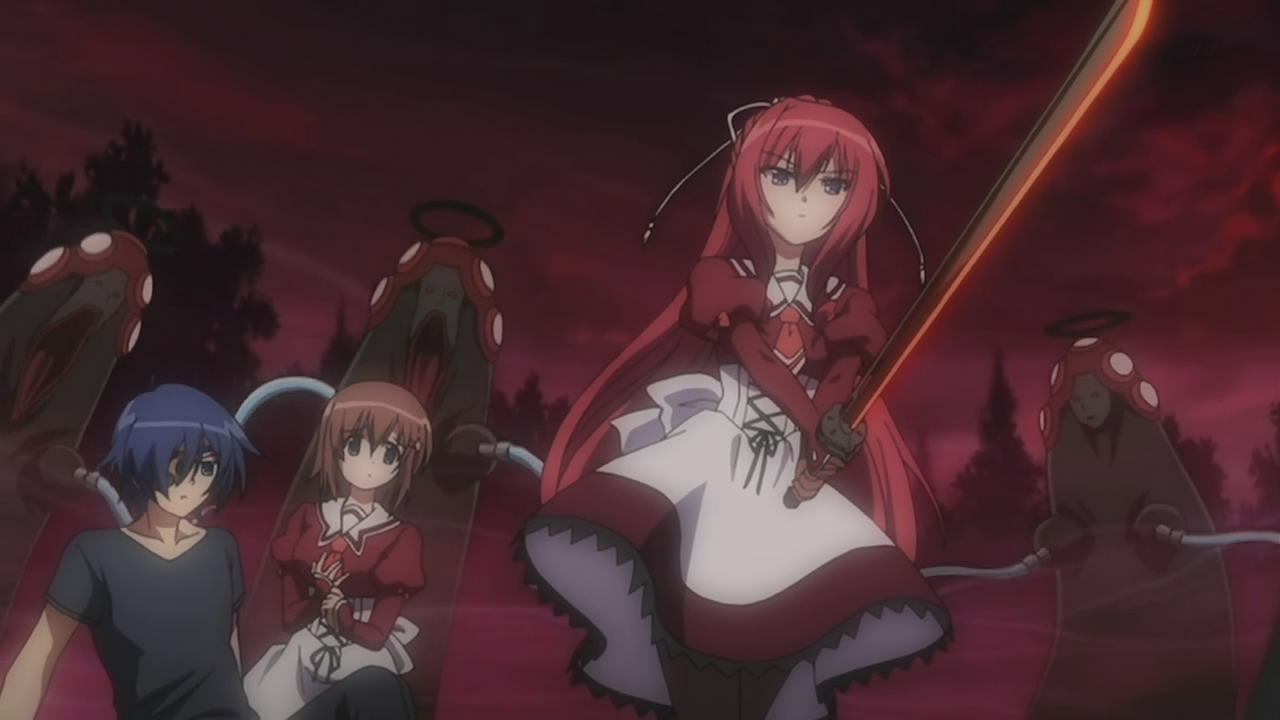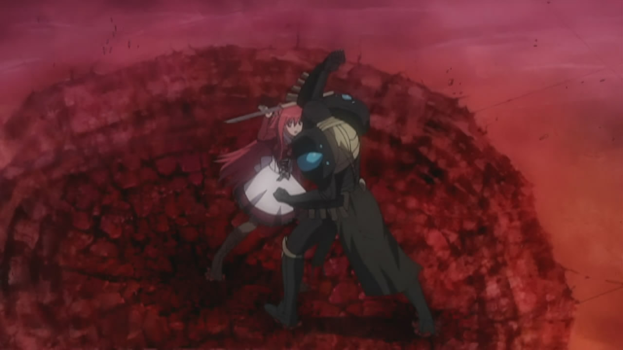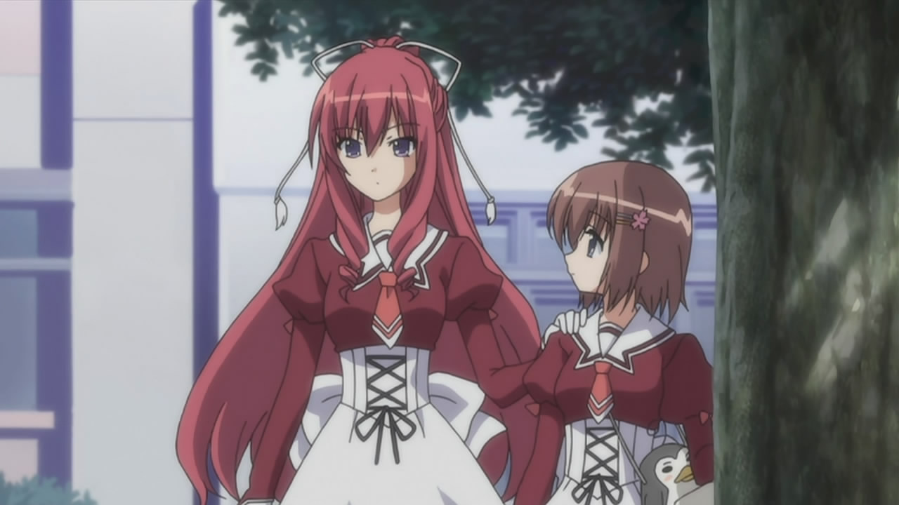 After 3 episodes I still think the school uniform looks stupid, I just can’t seem to get my head round it. That H-game character designer must really have had a strong maid fetish to dress up students like that. :PAs for episode itself imho it is a mixed bag. The first half was angsty, slow, and fairly boring. In fact I discovered that my attention kept wandering off and I had to rewind and rewatch some segments. However once the red night starts it is much better, but then again it is difficult to make watching pretty redheads with big flaming swords fighting monsters boring. 😀