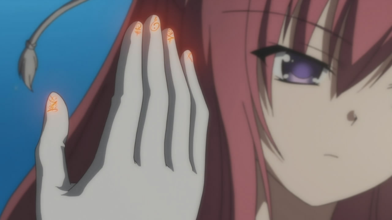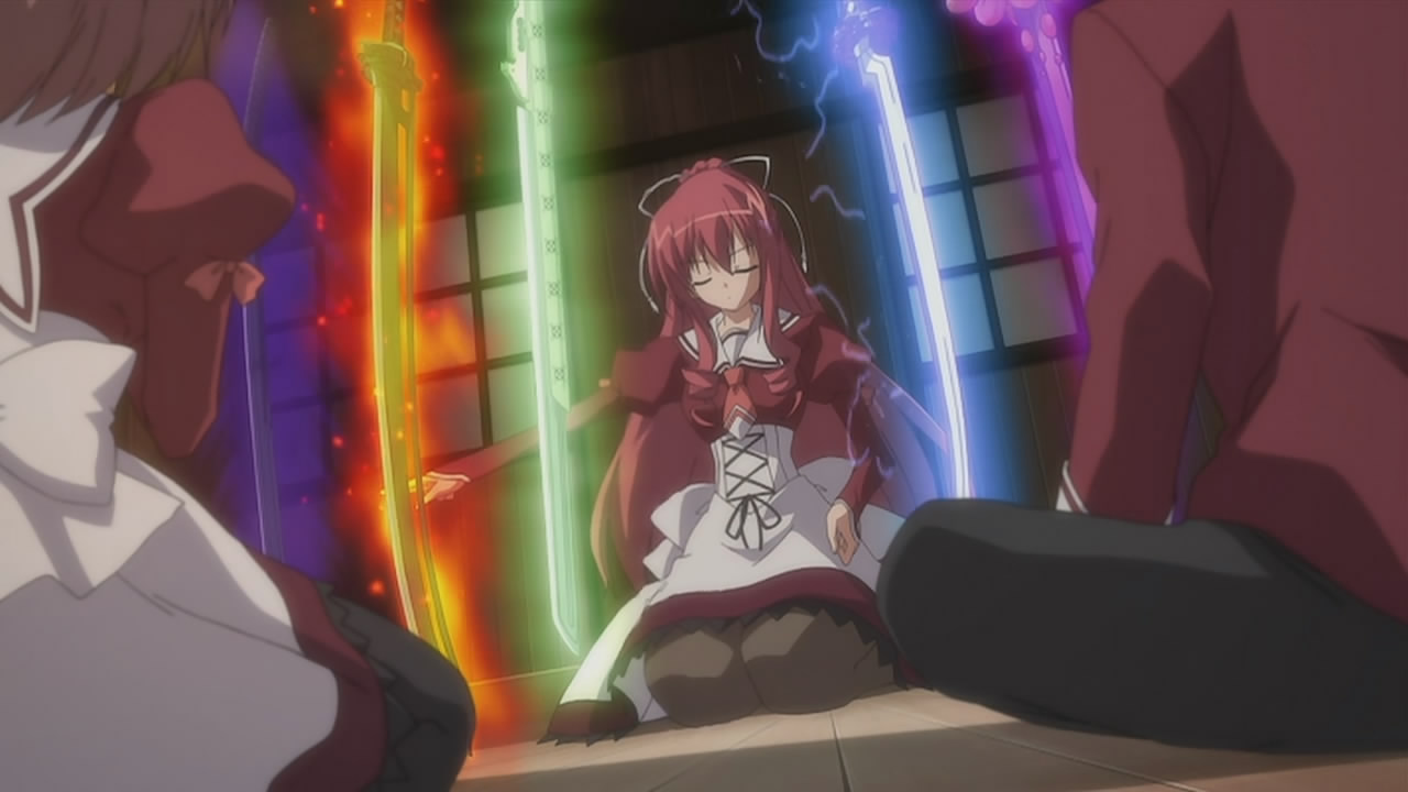 Back to the world of 11eyes, the Kusakabe family’s tradition of battling to the death over ownership of these five treasured swords explains how Misuzu came into possession of them. In her last challenge, she defeated and killed her own father — the head of Kusakabe family — for Yasutsuna. Despite going through the legitimate means, Misuzu is targeted by the main family for doing so and upsetting the balance of power by obtaining all five swords. Most of all though, they want her dead for being a teenage girl that resembles a previous, powerful, female onmyouji (priest/sorcerer), Kusakabe Misao, who committed a taboo by combining Buddhist arts with Western ones (i.e. black magic). Incidentally, Misuzu also knows some of these forbidden techniques and uses one to conceal her five swords until she needs them.