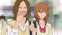I was going to comment on how the relationship between Sawako and Kazehaya has been developing so smoothly (almost too perfectly), and really it still is, but now there’s finally something to cause some conflict. Or so it appears anyway – Ayane and Chizuru might not believe that Sawako is behind the rumors, and it wouldn’t surprise me if they found out quickly that the new girl was actually responsible due to jealousy over Kazehaya. In that regard though, the story is proceeding a little slower than expected: after she was shown last week, I thought that that girl would have a bigger part to play in this episode instead of just a couple of short appearances. There’s only so much you can show about the development of a pure relationship without some sort of conflict coming into play. At least we got to hear her voice this time, though I’m not thrilled that it’s Hirano Aya. In any case, the next episode preview looked promising, and maybe things won’t be so smooth for Sawako and Kazehaya anymore.