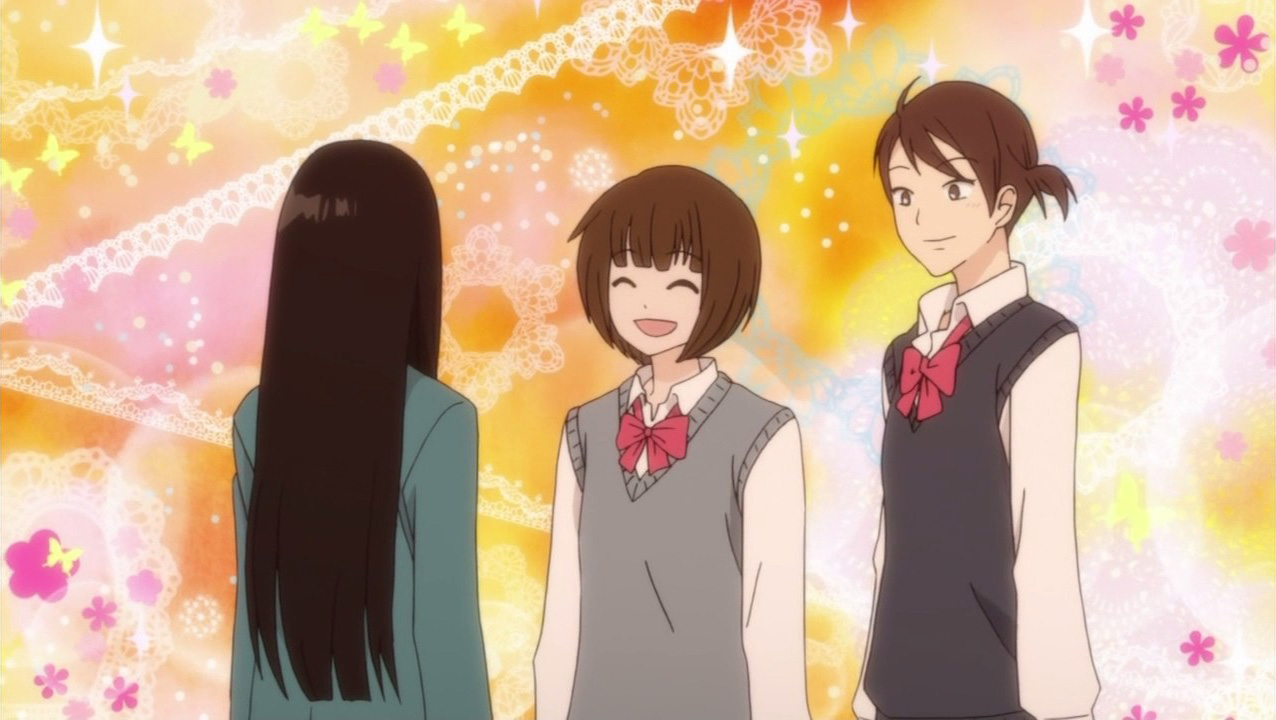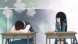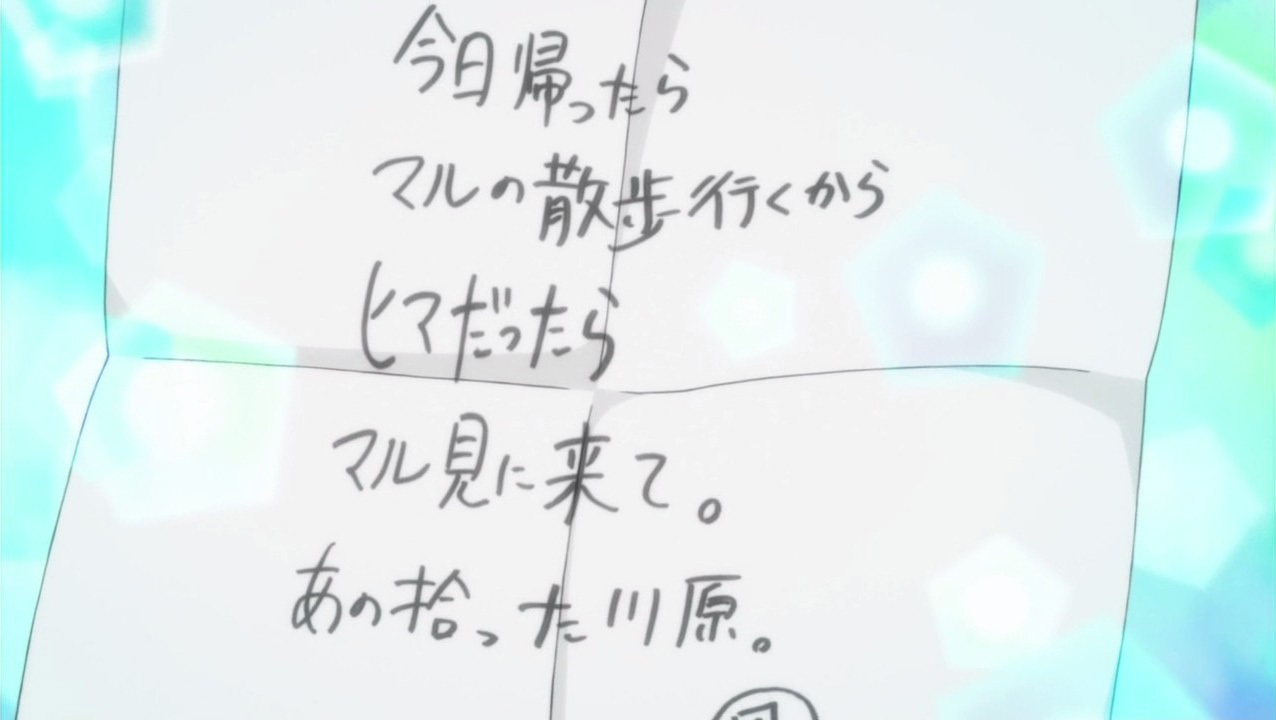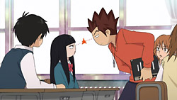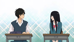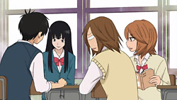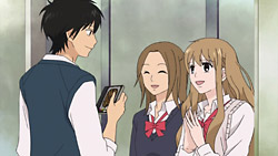 Sawako is still getting used to how so many people are now friendly with her, and she attributes it all to Kazehaya. On this particular day, he asks her to help him think of a name for the dog they found, but before she can answer, their substitute homeroom teacher Pin suggests Pedro Martinez. As it turns out, Sawako actually likes this name. She also learns from Ayane and Chizuru that Kazehaya has always been popular, and back in middle school, all the girls decided that he belonged to everyone. Later, Pin wants someone to work on the attendance records, so Sawako volunteers, but Kazehaya volunteers with her, and everyone else wants to help after that. This doesn’t sit well with Pin, so he calls Kazehaya to the staff room after class, leaving Sawako to work on the attendance book by herself. Fortunately, Kazehaya is able to sneak out of the staff room while Pin is in the bathroom, and he surprises Sawako by taking over and writing her name in the attendance book. After Pin calls Kazehaya back to the staff room, Sawako is able to meet and talk to two more classmates who came on Kazehaya’s encouragement.