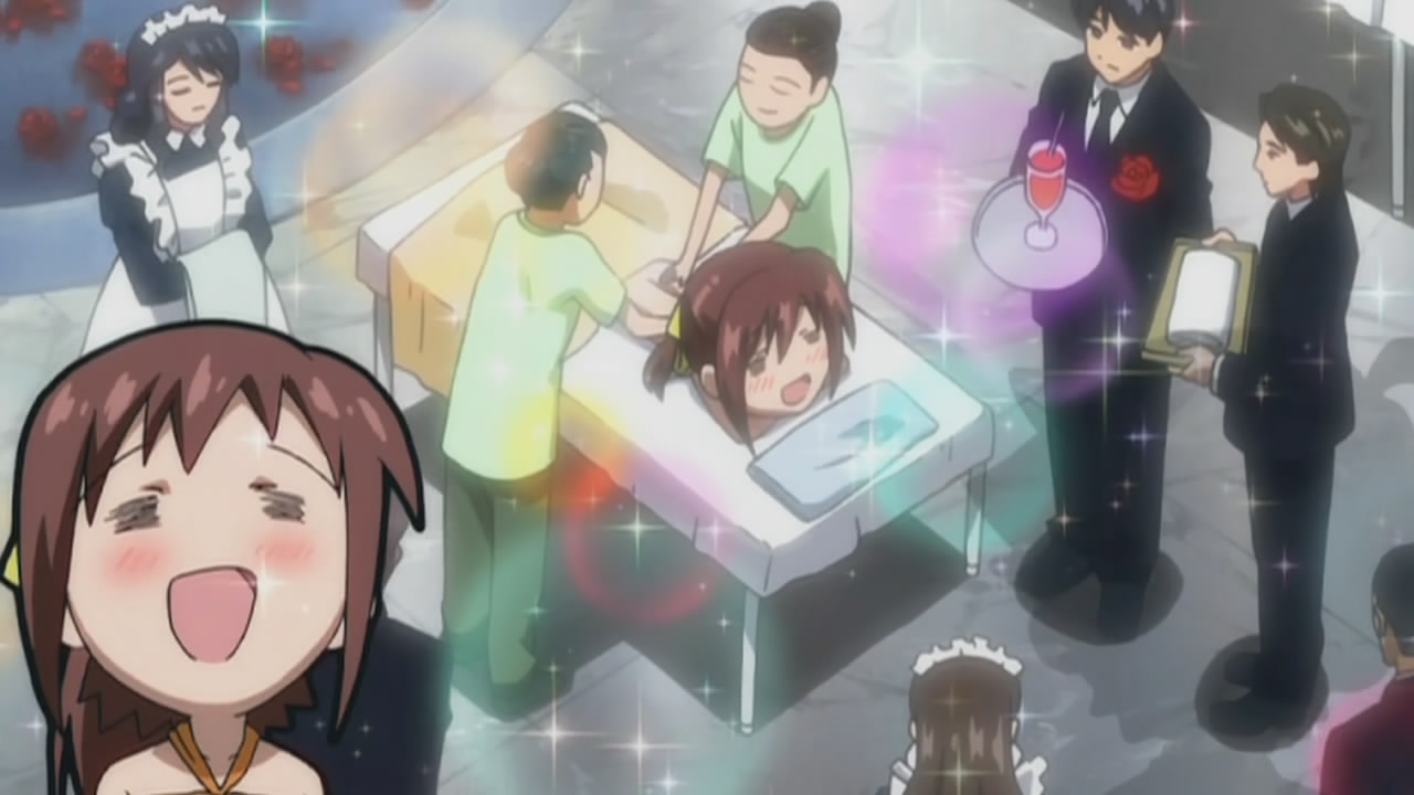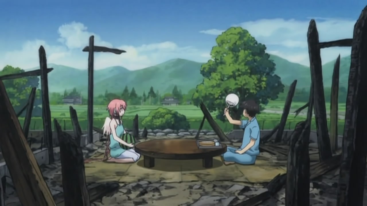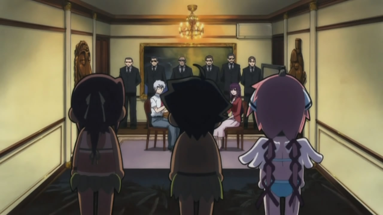 Remember Tomoki’s house and the whole pantsu bomb chain reaction that took place? Well lo and behold, the current state of things. With no place to live (and not using Ikaros’ power to rebuild the house for some reason), Tomoki asks Eishirou to stay if they can stay with him, only to find out about the random bear attacks there. (Un)luckily for them, Mikako is willing to take them in for the time being and invites Eishirou and Sohara along. Despite the tense atmosphere at the Satsukitane household, the envisioned celebrity life is surprisingly good, until Tomoki enters a sacred bath reserved for family members. To prevent the supposed impending disasters from falling upon the Sorami town, Mikako’s father says they have to decapitate Tomoki. Ikaros is the only one able to step in to save Tomoki (and probably kill everyone there for harming him), but she stops at her master’s request. Mikako’s father lets them go for now, but leaves “the rest” up to his daughter.