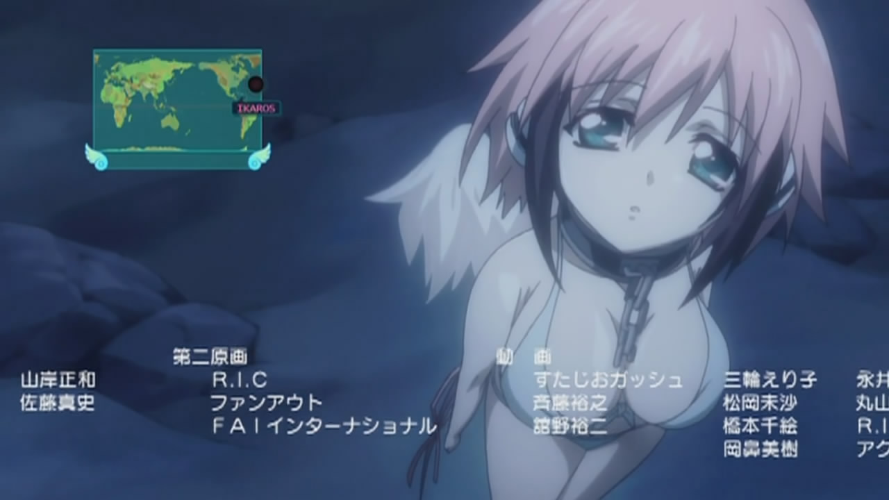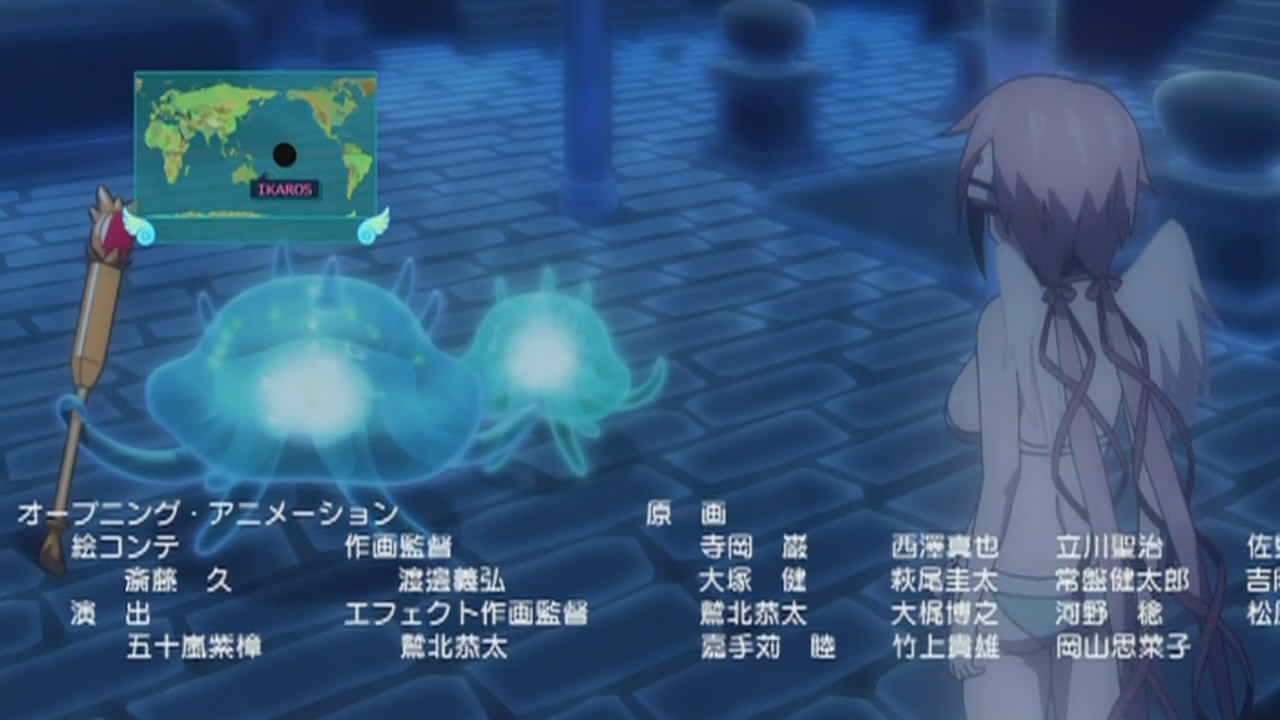 This episode’s ending was extra awesome because of Ikaros encountering the Mi-go funghi and Cthulhu sleeping on the bottom of the Pacific, something I would never expect to see in a random comedy anime, ever. They got the lat/long coordinates wrong, but still.My inner RPG geek is happy. 🙂
