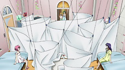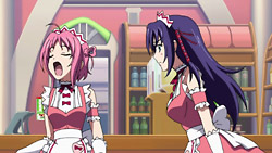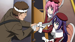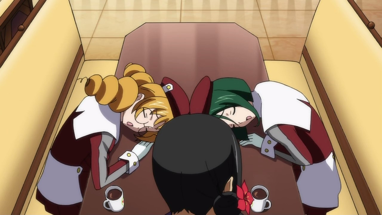 Ascoeur has recently developed a bit of a crush on Troisienne and wishes Q-feuille could be more like her. This fixation pisses Q-feuille off, and it develops into a full-blown fight after Ascoeur subsequently disrespects a collector’s item from an anime that Q-feuille loves. Their arguing keeps Alisa and Belle up all night, and as a result, their boss makes Ascoeur and Q-feuille fill in for their friends as front-desk receptionists the next day. Ascoeur and Q-feuille’s problems are set aside though when they encounter an injured man who needs to settle a draft in the next 10 minutes. Using their abilities, Ascoeur and Q-feuille are able to work together to find the right person to deliver this to, and they make it just in time. In the aftermath, the two girls reconcile, and Ascoeur is glad that Q-feuille is her partner. They learn later that it was actually Troisienne’s anime collector’s item that they found earlier, and, much to Ascoeur’s dismay, Q-feuille and Troisienne really hit it off.