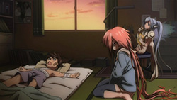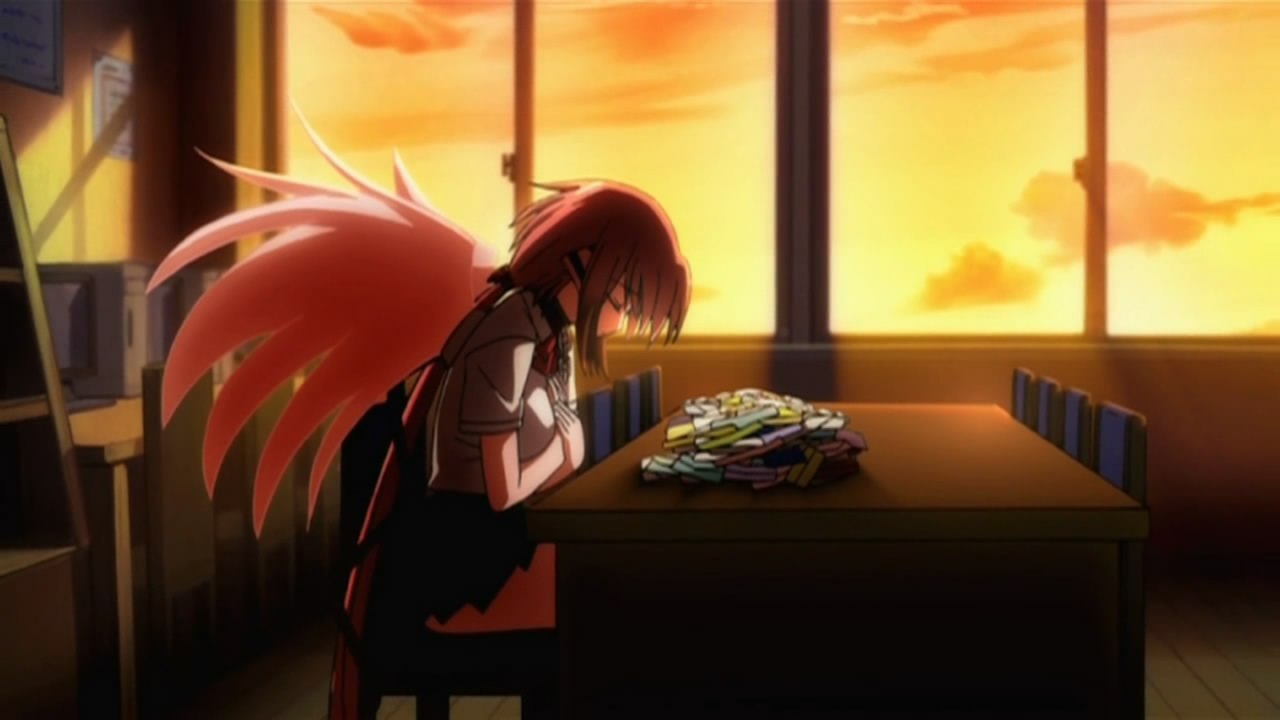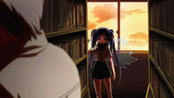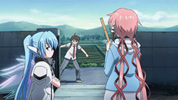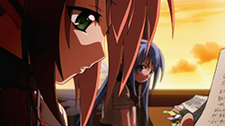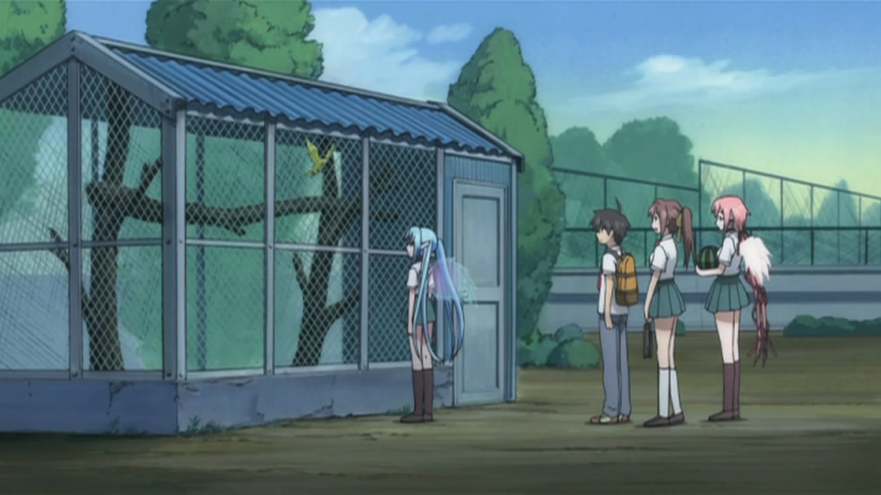Not everything was on a serious note though. On the comedic side, we see the return of a watermelon in Ikaros’ arms as The Second, Sohara getting shown her place amongst Angeloids, masochistic guys who like being called bugs by Nymph, and Tomoki being suckered into trying to fly. The last happened because of Nymph’s involvement, but it was funny to see Eishirou and Mikako there to help things along. It was even better when they put a serious spin on things to make it seem like Tomoki would actually succeed, but if you’ve been watching this show at all for the past while, you’d know it was just a huge fake out. (Even though this particular scene was stunning.) I never once doubted that Tomoki would fall flat on his face and get owned, but it was nice to see him encourage Ikaros and Nymph to continue going to school afterwards. Other than that, I found it funny how Ikaros wrote her name using four kanji that read I-KA-RO-SU, but made it needlessly complicated. As for some other interesting revelations, Tomoki surprisingly doesn’t see Ikaros in that way despite how good she looks. While that won you some points with Sohara, you’ve disappointed me as the master pervert Tomoki!