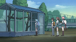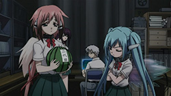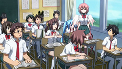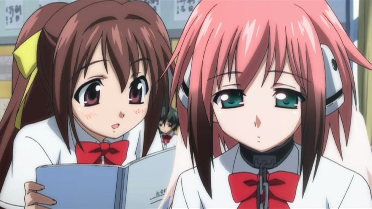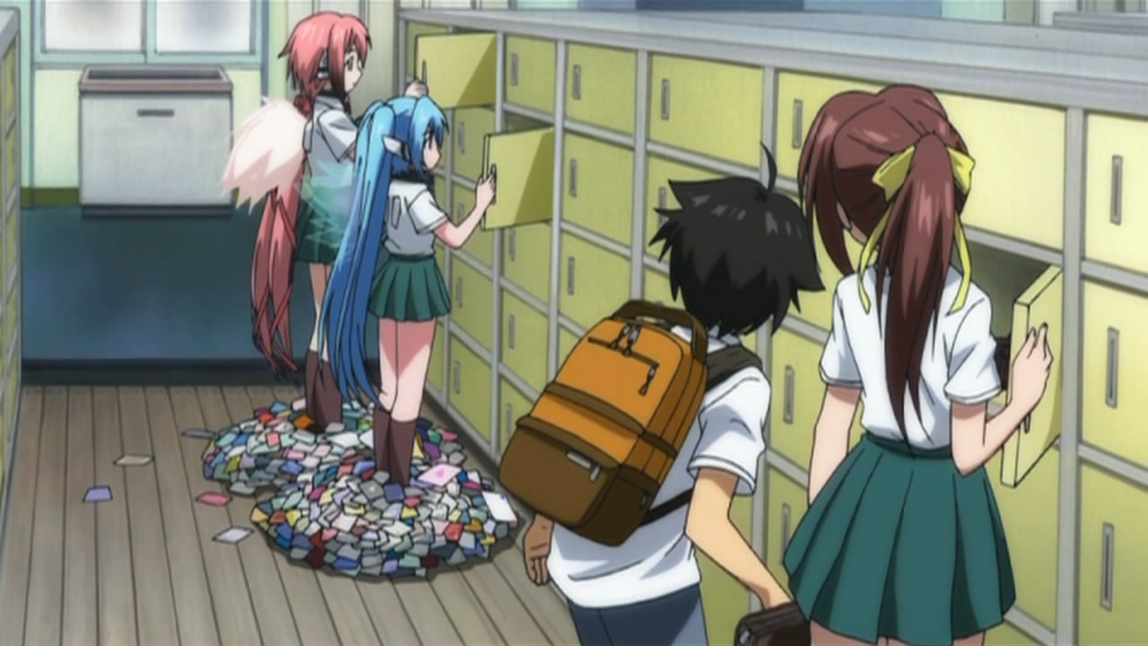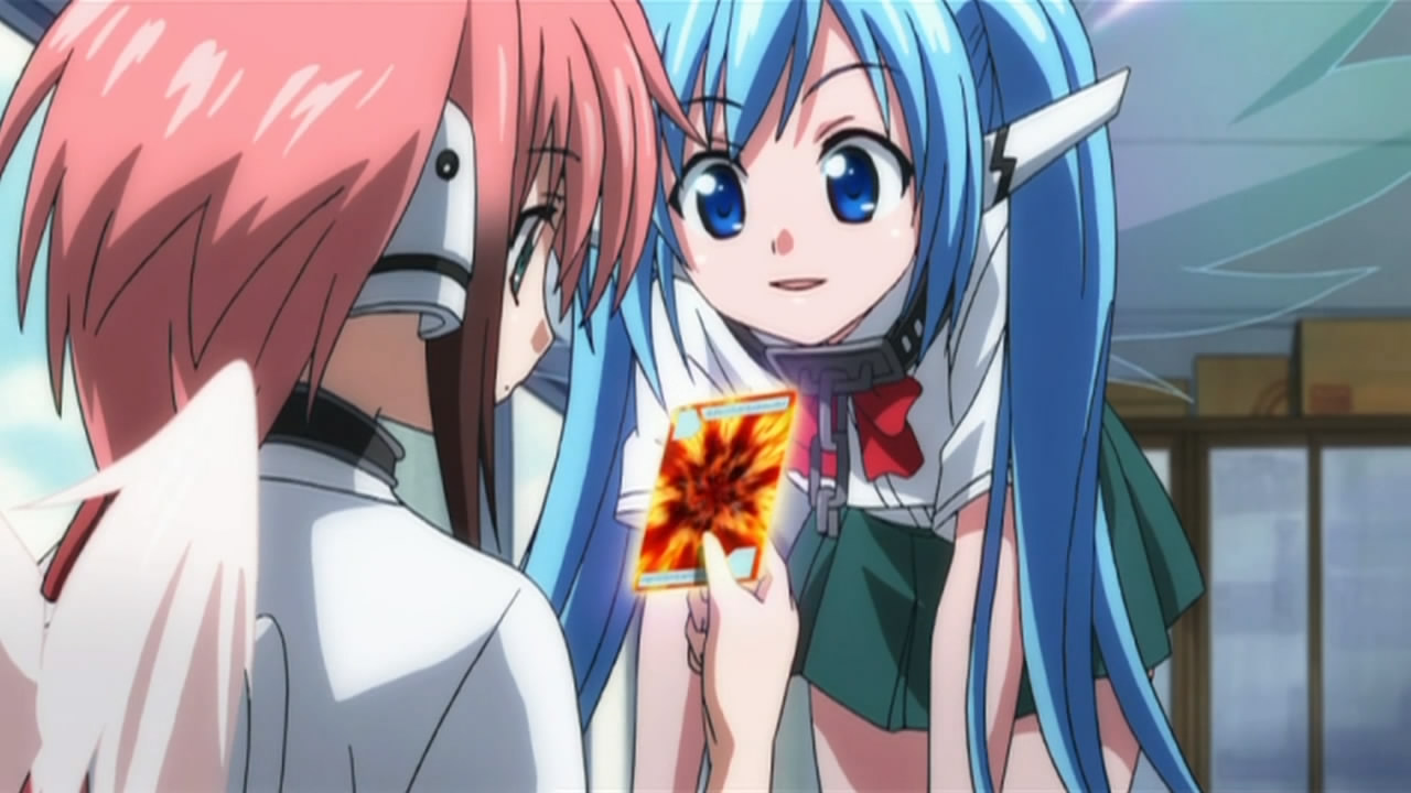 To start things off, our two Angeloids get recognized as transfer students with the help of one of Ikaros’ alpha cards and some memory manipulation on Tomoki’s teacher. This of course puts Tomoki’s peaceful days down the crapper, but he eventually caves in to the idea of giving Ikaros’ a more human-like lifestyle. Hearing this, Sohara takes it upon herself to help them get accustomed to life at school; however, the two of them prove more than capable of handling everything from studies to cooking, leaving her feeling inferior in every way. As the cute, new, top students, Ikaros and Nymph’s popularity goes through the roof and all the guys at school start giving them love letters. While Nymph’s intent on just tossing all hers in the garbage, both her and Ikaros decide to read them after Tomoki insists on taking the senders’ feelings into consideration. In Ikaros’ case, she diligently reads them all despite having no understanding of love or romance. This gets on Nymph’s nerves so she decides to scan Ikaros, revealing what she’s already suspected — most of her functions and all of her memory/emotions have protection placed on them. This leads her to believe that Ikaros is the “Uranus Queen” who rocked the Synapse before, which she later reports to her master on Synapse and promises to bring Ikaros back.