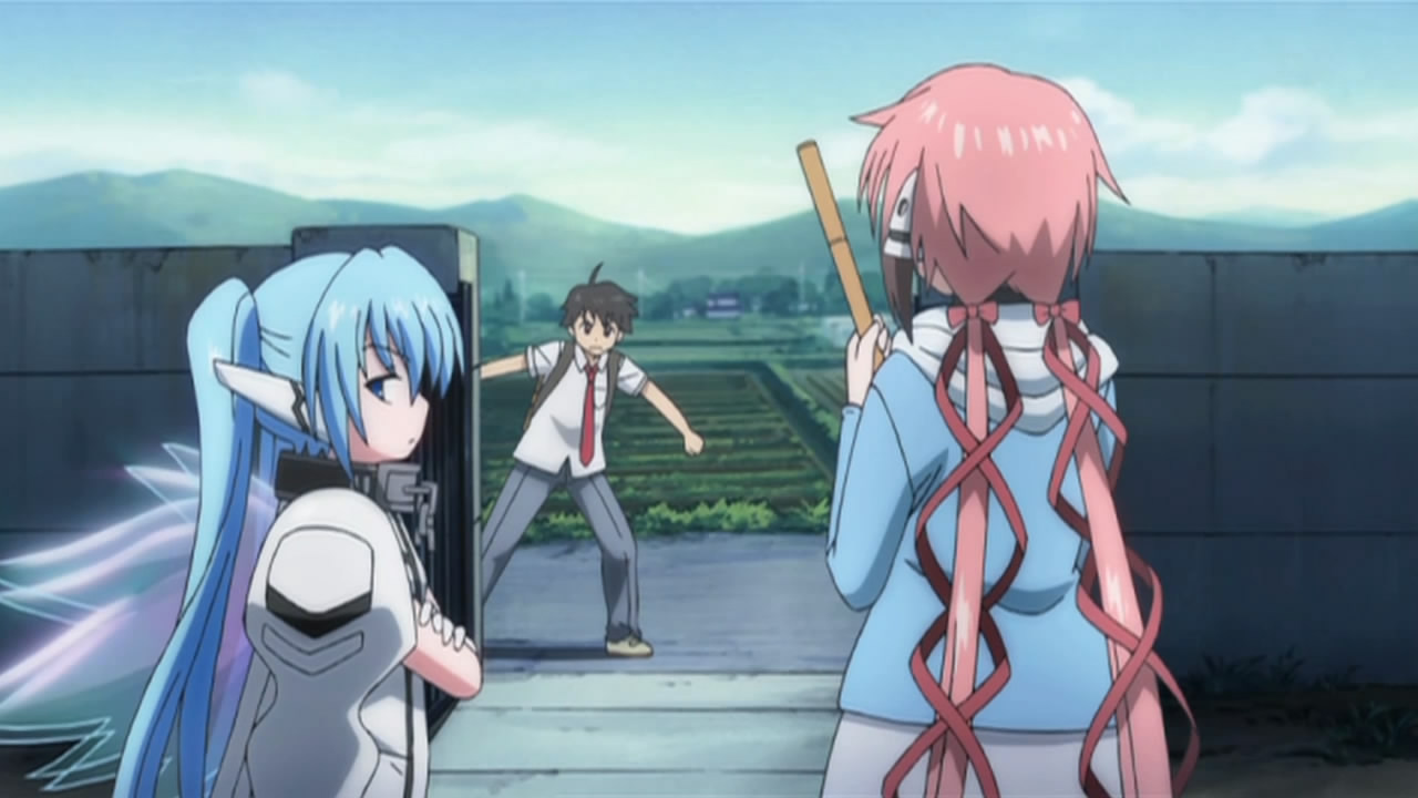 Well things sure picked up plot-wise. While some viewers criticized the series for being too devoid of plot early on, I think it only makes sense to have the nonsensical comedic stuff up front here. Now that things have taken a serious turn in terms of the Synapse, Nymph’s true objective, and Ikaros’ identity, it’s kind of hard to have the characters continue messing around like they have been. For most comedies, once a trace of a plot begins to surface, I find that things rarely return to their lighthearted ways until it’s resolved. In the case of one cour series (i.e. 12-13 episodes), there’s usually only enough time for this pattern to happen once (and often at the tail end of the story). As such, I don’t really see a problem with them holding out until now so that the series can conclude on a high note. It’s pretty standard affair. KIDDY GiRL-AND is going the same route as did Sora wo Kakeru Shoujo.