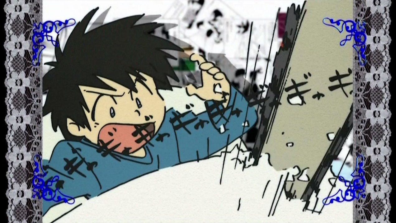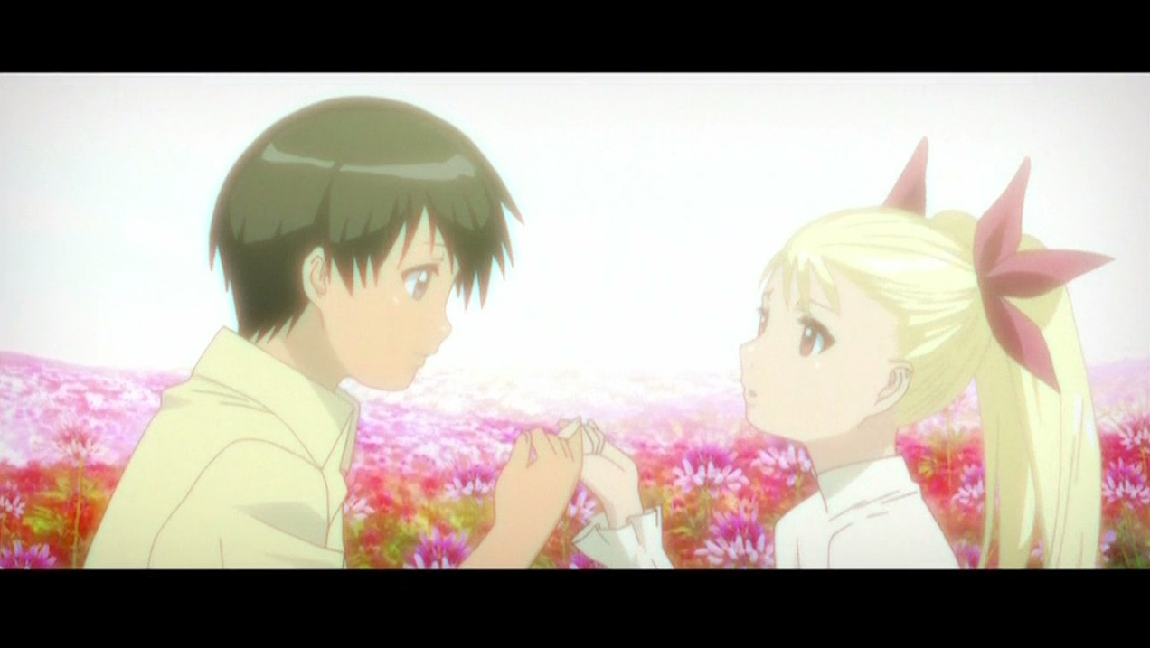 Well, I love the show, especially ep2. Based on that episode, I think it’s Shinbou’s best. The episode direction is just stunning: the visual and aural rhythms, the use of music, the story flow. I’ve read and enjoyed the manga, but I don’t think it was so good it couldn’t be improved. And it seemed to me to get pretty slow and aimless after a while. Anyway, I prefer shoujo to shounen and am very happy to see as much emphasis on the romance as possible. As for the OP, it’s definitely my favorite of the season so far. The music is good (an updated 80s song), the visuals excellent (flowers, scenes, and dance), and the way they are put together is wonderful. Mina’s dance looks a bit awkward at first viewing, but she is going faster than a human could, and that takes some time to get used to. The OP is made for the long run, it seems to me.