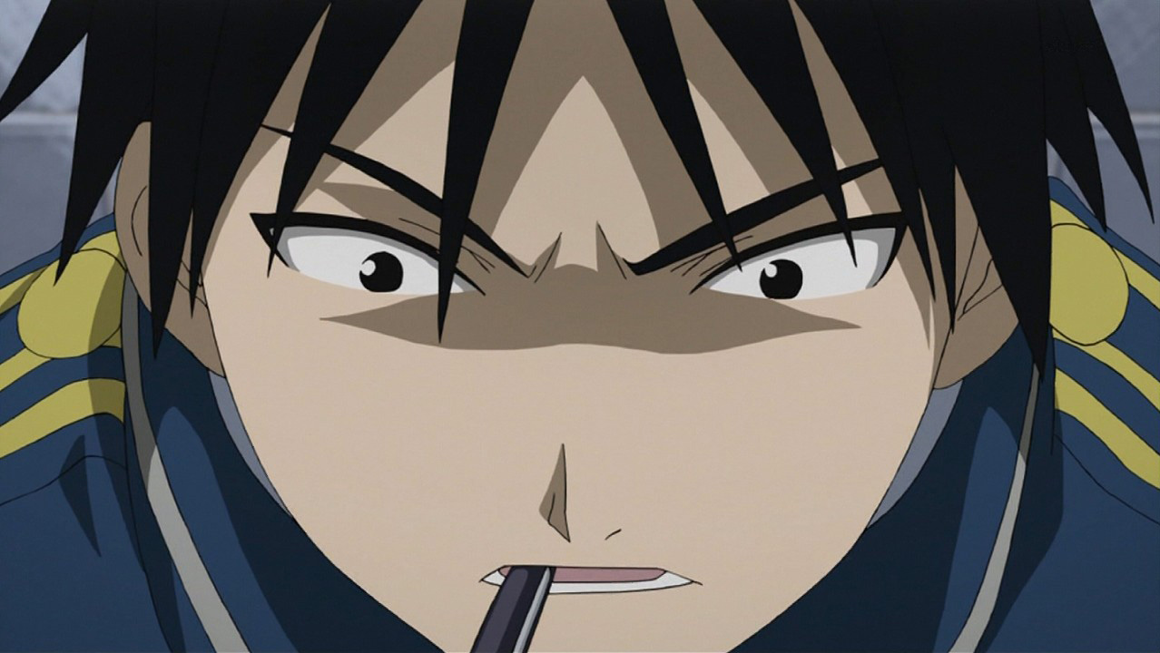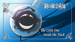 The anime will end in 5 months, mark my words.Anyways, I like that they shortened the scene with Roy and Riza; in works in manga, but in anime it would be boring and take too much time.And I like Viz’s name for the Homunculus better, “The Dwarf inside the flask”, instead of “The Little One”. 😛
