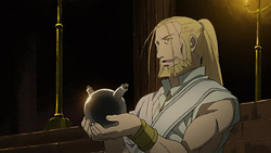 Sometime later, the flask was brought before the king of Xerxes because the king wanted immortality, and based on its instructions, the king had his men dig an irrigation channel around the country and had ordered bloodshed at the key spots. Once it was done, they had initiated the ritual, but everyone then started dying, including the king himself. As it turned out, the true center of the ritual was where Hohenheim was standing with the flask, and when it was all over, they were the only two survivors in the entire country. Both of them were now immortal, each with one-half of the country’s souls, and Homunculus had chosen to take on Hohenheim’s form. Back in the present, Hohenheim wakes up from this memory while on a train and happens to run into Izumi and her husband. When Izumi starts coughing again, Hohenheim learns what happened with her and then plunges his hand into her abdomen. He uses his power to rearrange her insides to improve her blood flow and then tells her that she can’t die yet. When she questions what he is, he calls himself Van Hohenheim, a Philosopher’s Stone in the form of a man. At around this same time, Ed is telling Miles about the many shapes of the Philosopher’s Stone and how he’s never seen one bigger than a small stone. He doesn’t want to see a huge one either because of the unthinkable number of lives that would be needed to create it.
