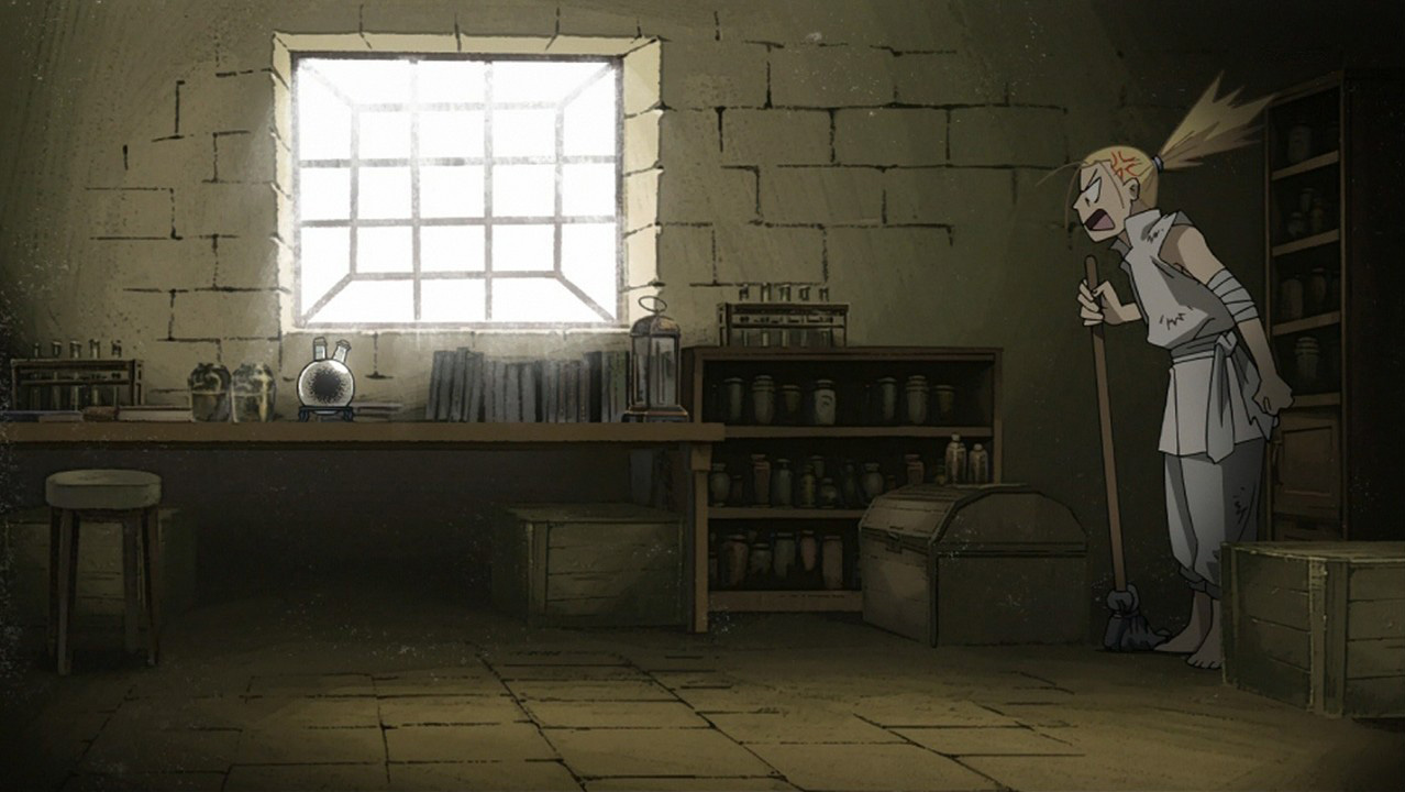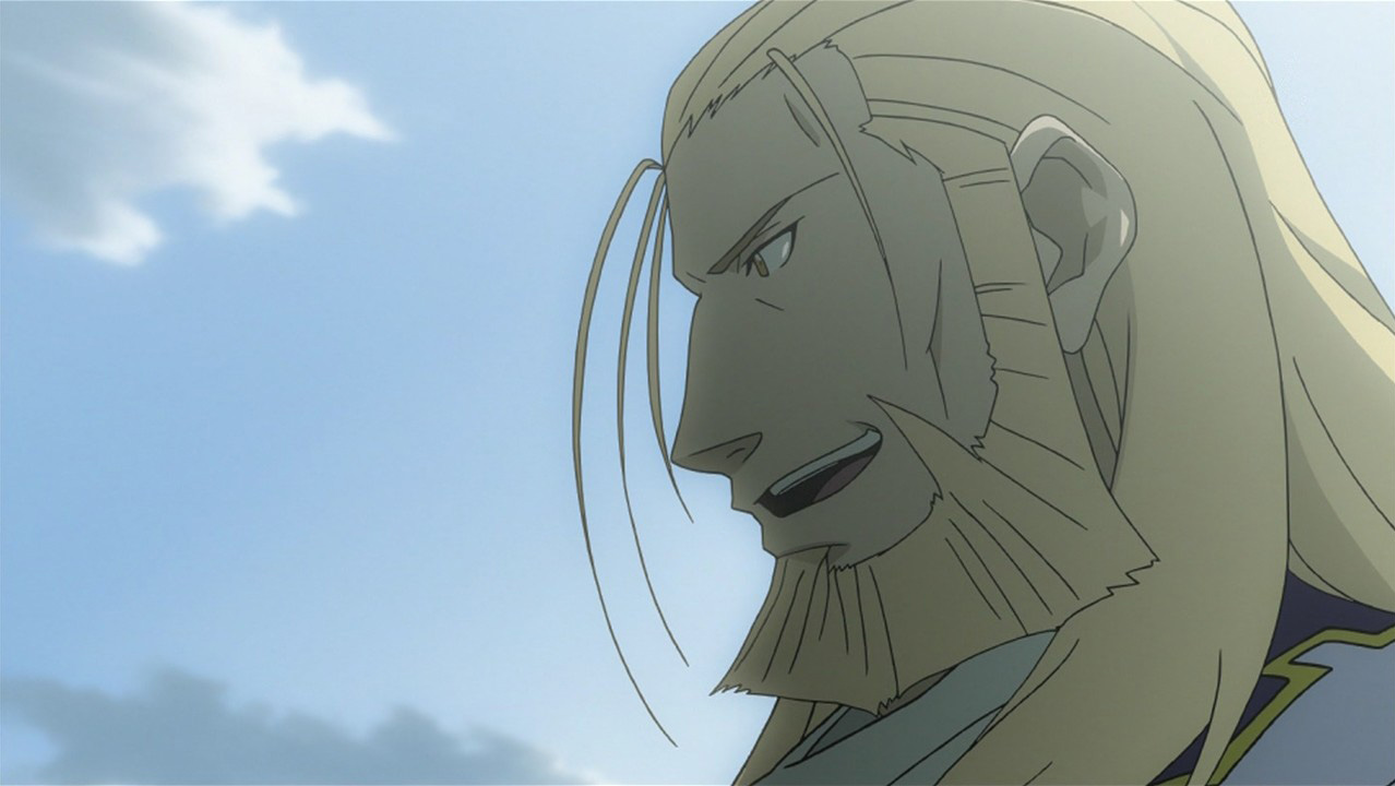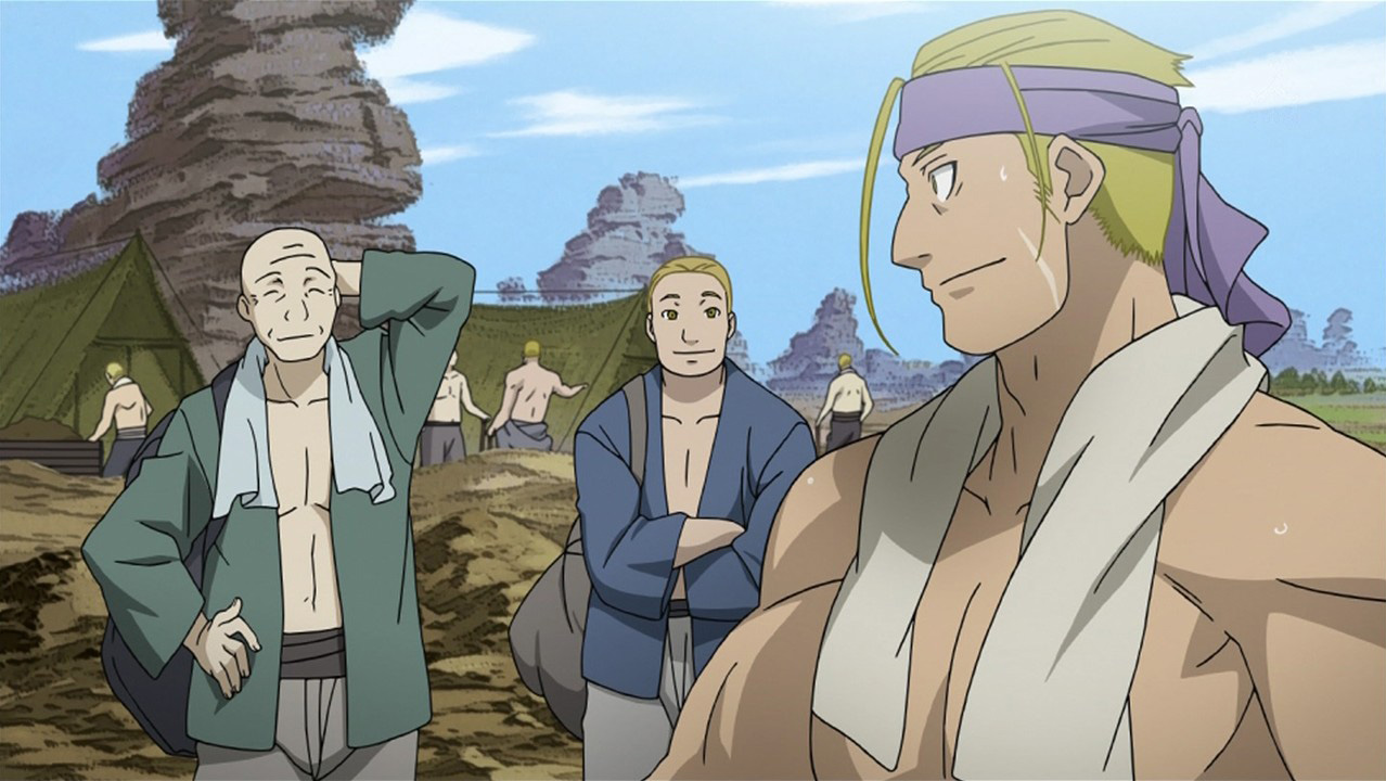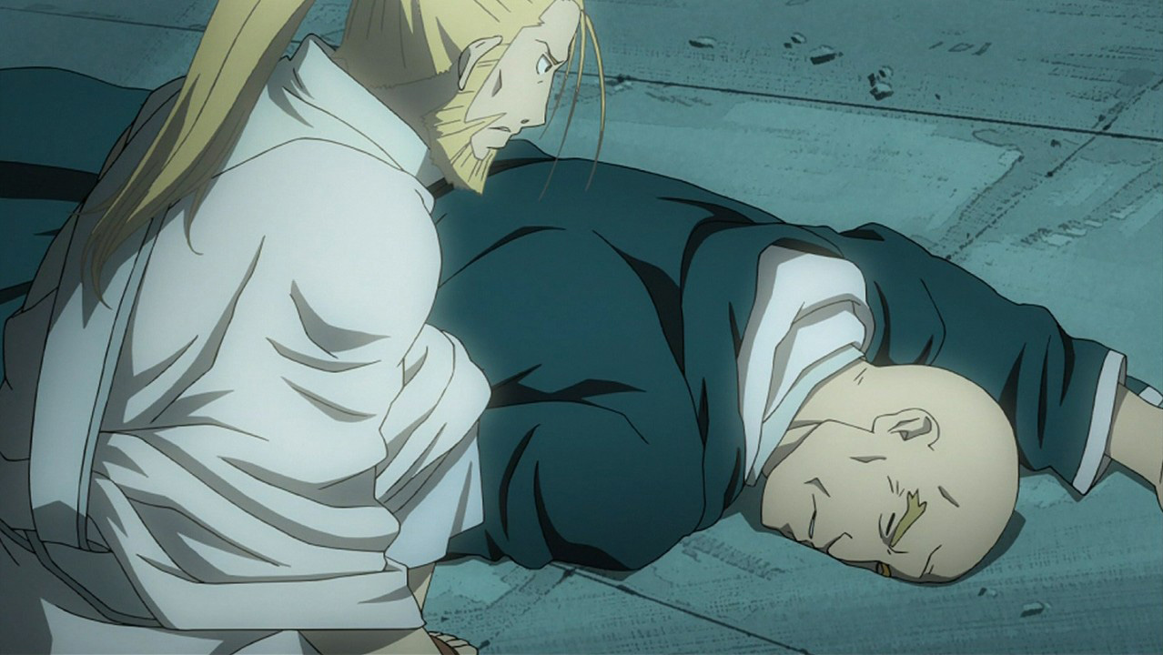 Yeah, they did a pretty good job with Hohenheim’s past. The only thing I would have done differently is include the scene with him teaching the other slaves what he learned from the Homunculus, because then it makes everyone’s deaths a little more tragic because he’s connected to them. But it was fine as-is. What I really liked was the voice of the Homunculus. Really unsettling. I was wondering what they would do with that, thinking they might go for the voice of Pride, but it’s different, and yet similar. You definitely get that he’s a little creep. Hohenheim’s encounter with Izumi and Sig seemed more serious than in the manga, too, for some reason, which is good. For some reason, I chuckled when Sig hit him in the manga, but here it really looks like he was frantic to save his wife. And I love Izumi and Sig, they’re my favorite couple in FMA. Good episode.