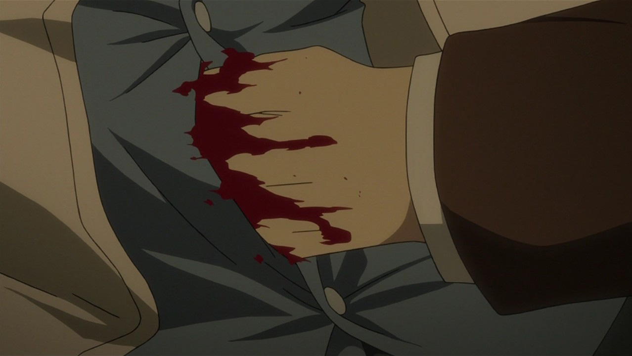 Quite some episodes ago I was speculating that Father and Hohenheim where the same person split into two, something along the lines of Hohenheim using Alchemy to seek immortality and ‘Father’ was born as an unintended consequence. I guess I was right in that they share the same blood, vessel if you will. But still, HOLY SHIT I WASN’T EXPECTING WHAT JUST HAPPENED. That was an awesome episode, particularly how directly they dove into the subject and still managed to convey the sense of disparity that Hohenheim suffers when he realizes what just took place, from his odd ‘friend’ in the flask massacring everyone to the sense that he will never possess the family and love that he strove for – due to his now cursed body and immortality.