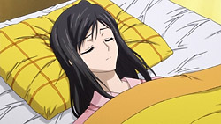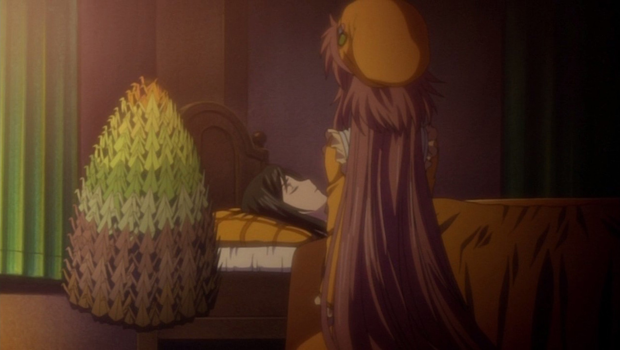 After having messed up some origami paper, Kobato tries to apologize to Sayaka, but Sayaka suddenly collapses in front of her. Worried, Kobato rushes over to Kohaku’s house and gets Shuuichirou since he’s a doctor. After examining Sayaka, Shuuichirou diagnoses her with fatigue due to lack of sleep and minor gastritis, and he gives her some medicine. Kobato stays at Sayaka’s bedside until Kiyokazu suggests that she look after the children instead. What gets Kobato out of her funk for the time being is helping the children fold 1000 origami cranes so that Sayaka will get better. After the children go home and Kiyokazu goes off to his part-time job, Kobato returns to Sayaka’s bedside, and, when Sayaka finally wakes up, she apologizes for making Kobato worry. She starts talking about the case where something might happen to her, but Kobato doesn’t want to hear it because it’s too sad.