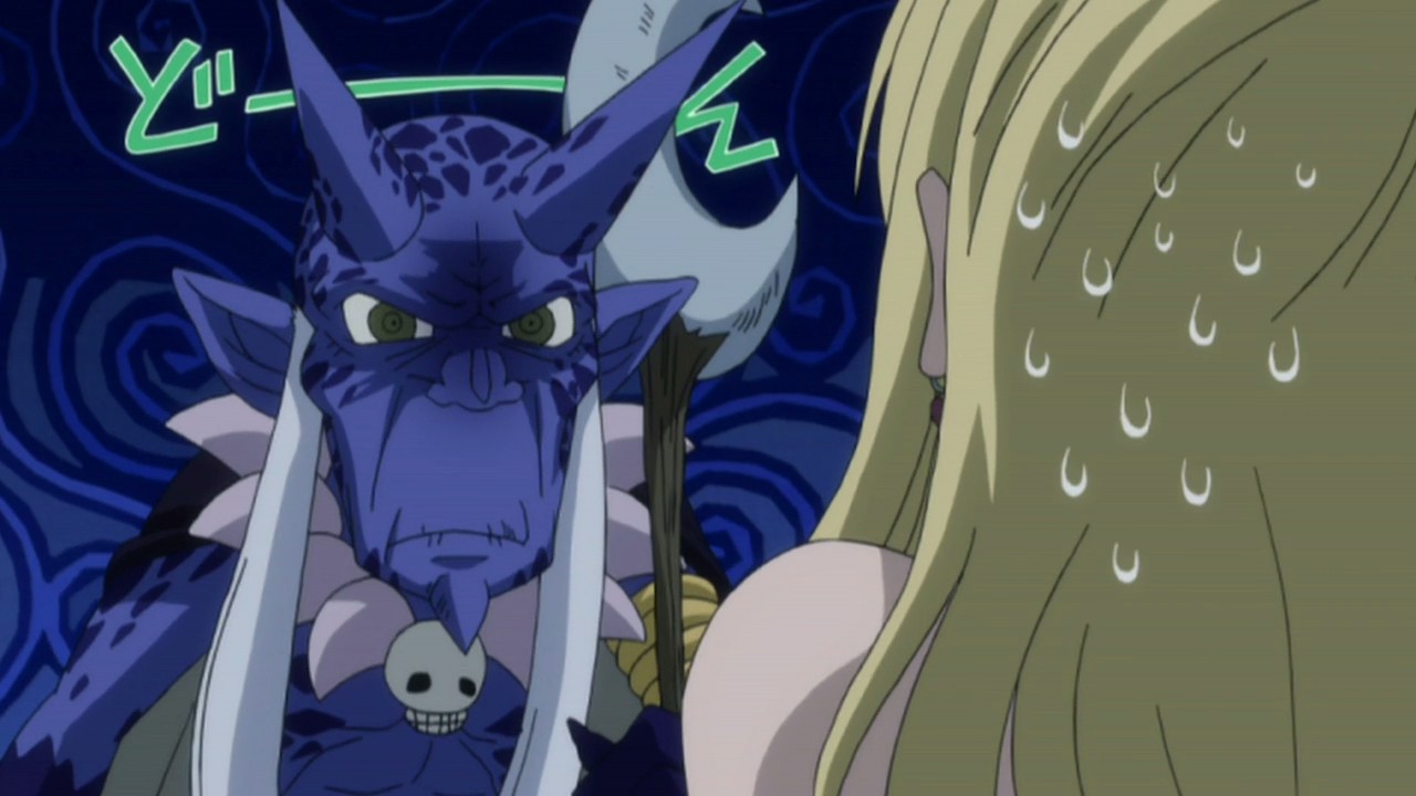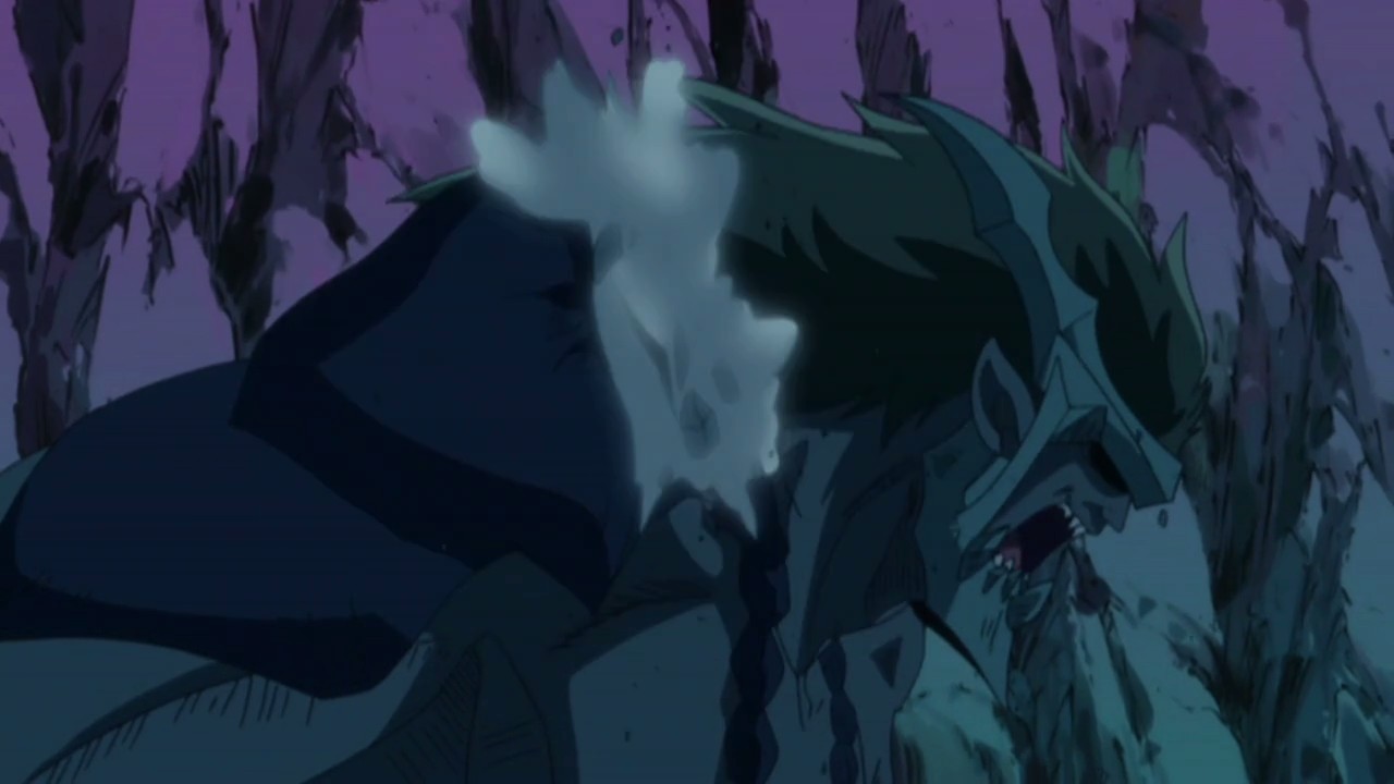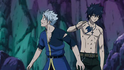 While fighting Zalty’s time magic, Natsu learns that Zalty plans to try to control Deliora for his own purposes. Natsu is able to knock him out at around the same time that Erza attempts to stop the Moon Drip ceremony on the top of the ruins, but it’s too late, and Deliora starts moving again. Gray’s plan is to sacrifice himself to cast Iced Shell on it again, but Natsu gets in front of him and trades punches with the monster instead. Much to everyone’s surprise, this leads to Deliora crumbling, and Lyon realizes that all these years in the ice has taken its toll on Deliora’s life. Remembering how Ul had said she’d seal away his darkness, Gray can’t help but cry in appreciation. In the aftermath, Gray tells Lyon to join a guild somewhere and find a new goal. The more immediate problem though is the fact that the villagers are still effected by the curse since Deliora wasn’t responsible for it – Moon Drip supposedly was. Strangely, the village itself is back to normal now, and when Erza questions them, the villagers eventually reveal that their attempts to reach the ruins all failed for some reason. Having figured out what the problem is, Erza decides to go ahead with the villagers’ request to destroy the moon.