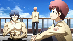 As for Hinata and soon to follow Takematsu and Ooyama on diversion duties, the slow motion replays of the propulsion engines that Yuri strapped under their seats was pretty much laugh-until-you-cry funny because of the way they played snippets of the Brave Song ending theme during them. The absolute fear of trying to come up with a good diversion or reaping the skull-splitting pain from Yuri’s ceiling-crashing backup plan was just as good too, because it became blatantly obvious that she only got this many people for this operation so that she could cycle through them. Her “boy who cried wolf” reasoning didn’t sit too well with Takematsu though, so I thought he gave it a good attempt when he stripped down and declared that he’s actually a person that looks surprisingly slender in clothing. Likewise with Ooyama having to confess to Tenshi in front of everyone and her accepting (!), which was hilariously followed up by a second round of some one-on-one ceiling time for Hinata because of the supposed emotional damage Ooyama already endured. So with that, I guess Yuri is considerate of other people’s feelings… about one in every thousand times.