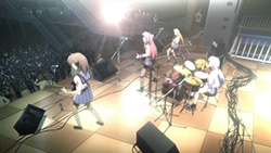 Those were undoubtedly the comedic highlights, but there were some subtler jokes such as Yuri’s suggestions for incorrect answers for Takeyama to put on the sabotaged exam, which ranged from aliens invaded the Earth for world history to answering everything in katakana for English. Due to that and everything mentioned above, I have to say that the humor doesn’t cease to both surprise and entertain me to no end in this series. I also like how they’re pumping out concert scenes like no tomorrow with another Operation Tornado (i.e. steal meal tickets), which had Yui as the new lead vocalist/guitarist performing a song that Iwasawa left behind, “Thousand Enemies”. Given how Yui wrote the lyrics to that song and how we’re back to the normal opening sequence now with Yui replacing Iwasawa, I think it’s pretty safe to say that she’s the new face of Girls Dead Monster.