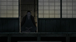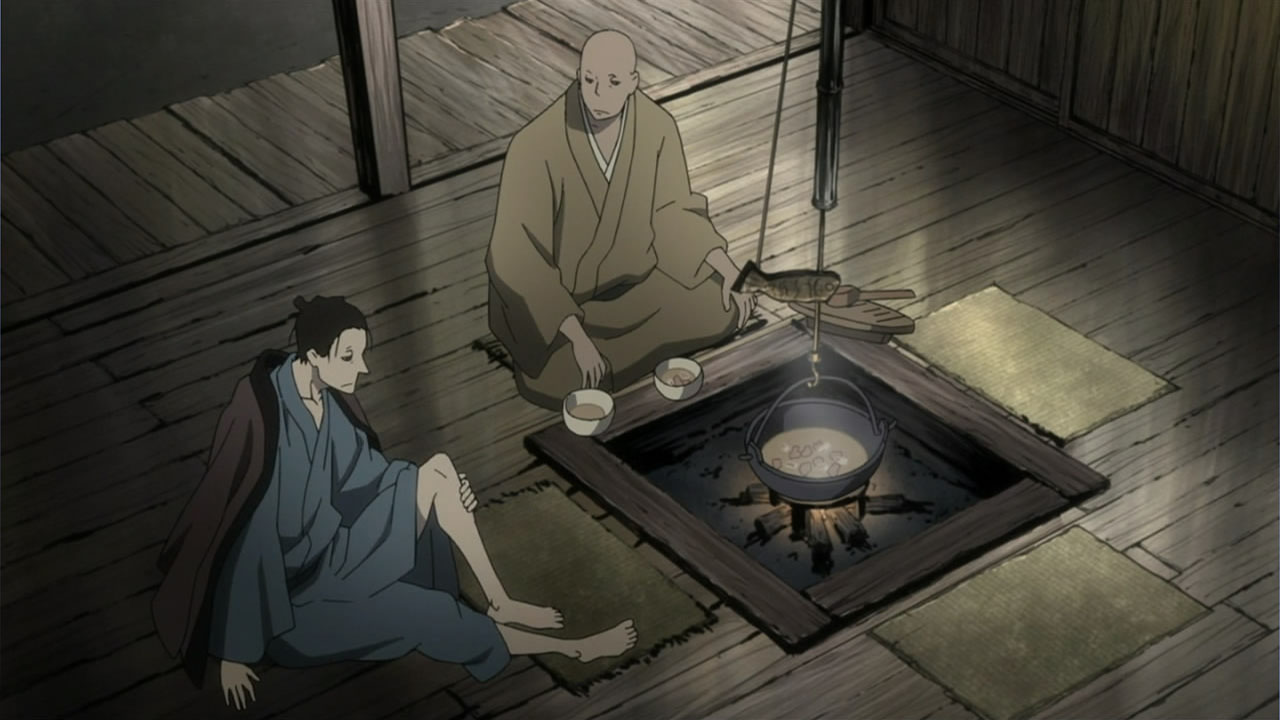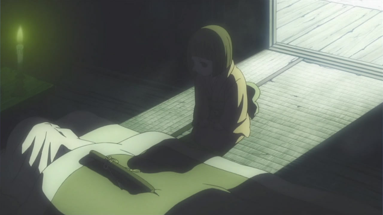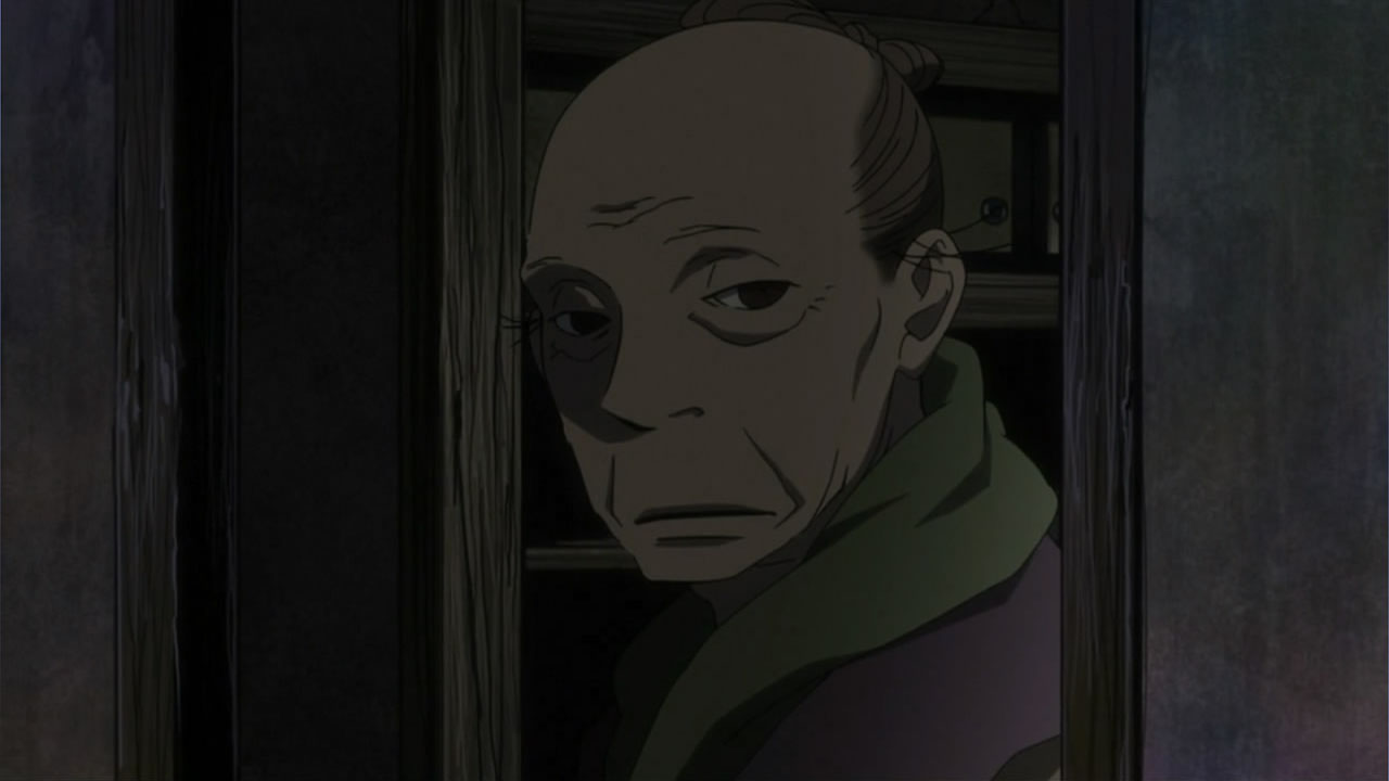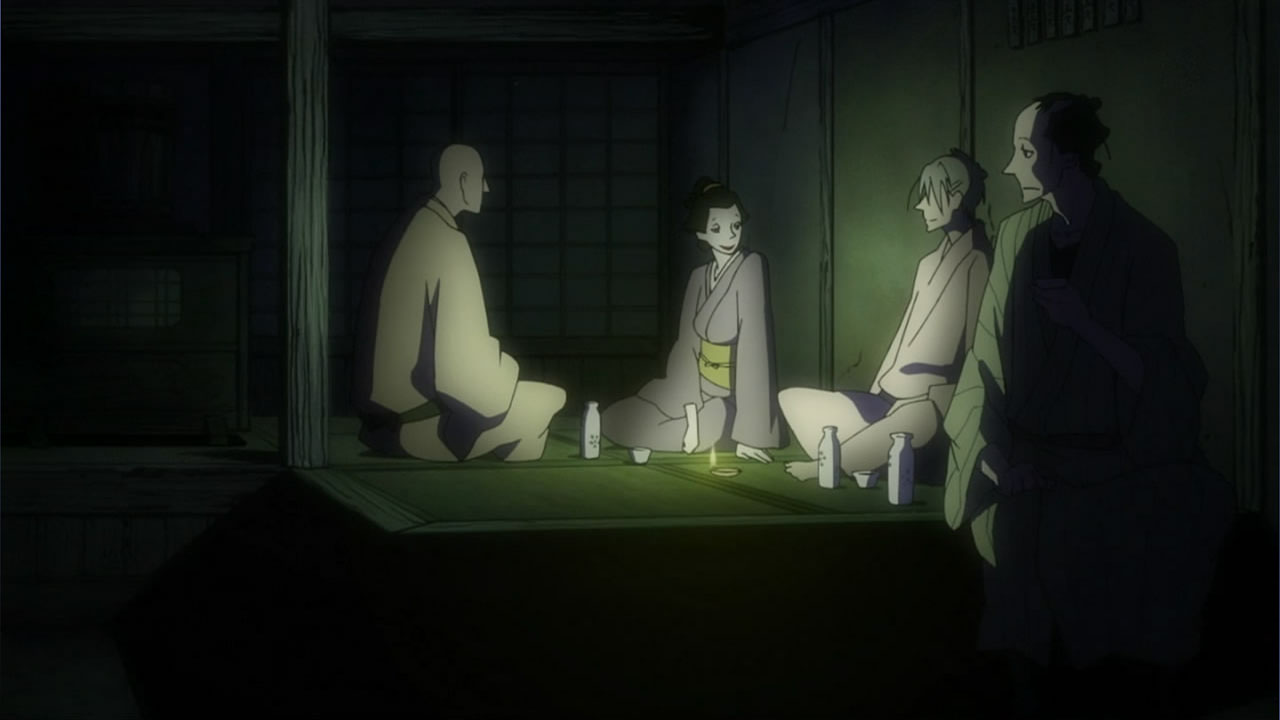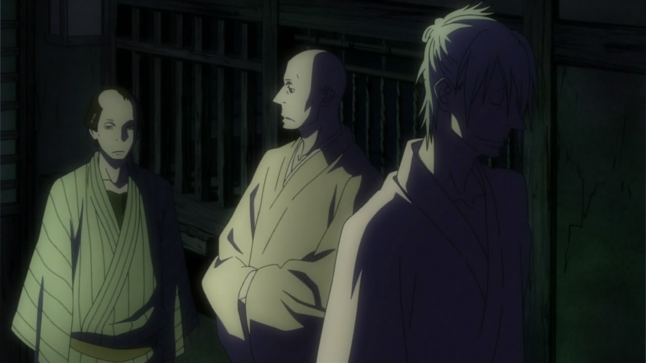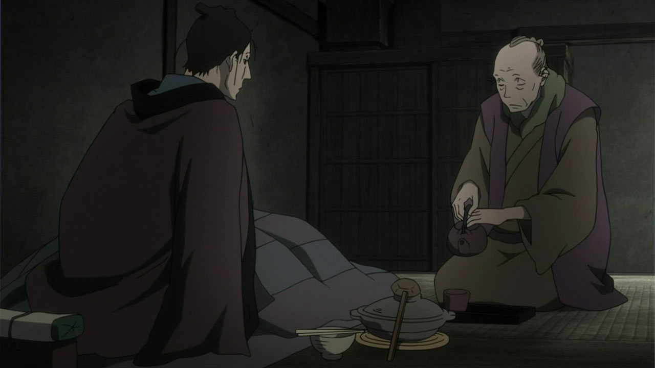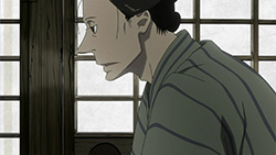 This series reminds me a lot of Mushishi as well. Not just because of the obvious similarity between the lead characters, but because of the similarity in the pacing, backgrounds and architecture. It’s kind of a shame that we remain in a few recurring settings because the art style lends itself to portraying the wilderness and other environments. Unlike Mushishi, this series seems to be a bit greyed out; even in non-flashback scenes, the red hues are dimmed and dawn/dusk shots are limited.Yaichi’s flashbacks are progressing normally while the backstory of the group is moving in reverse chronological order. So they’re saving Otake’s story and the missing pieces of Yaichi’s history for the end? I like the pacing in this series, but it doesn’t lend itself to finding a suitable end point. I’m hoping they don’t plan on adding some melodrama to force Masa to join or leave, and rather let his decision come naturally.