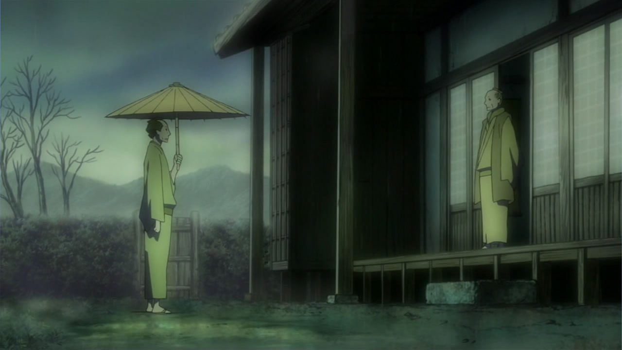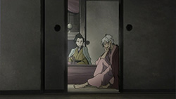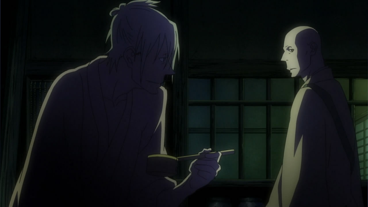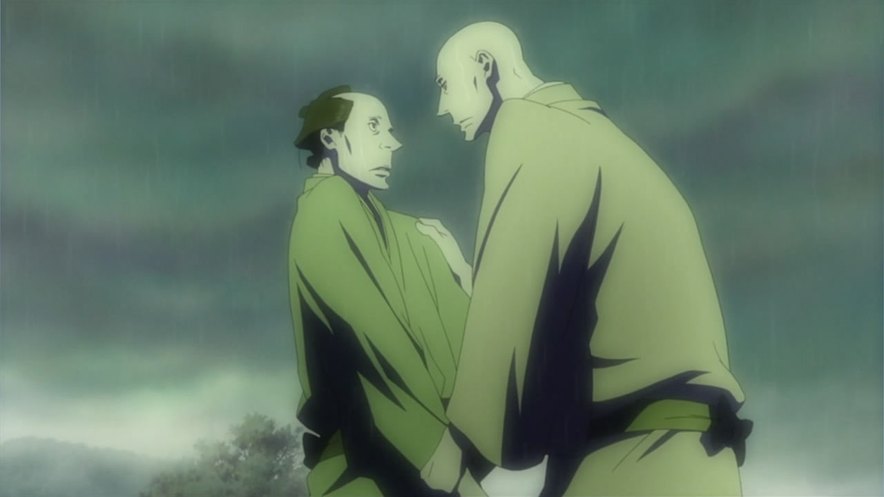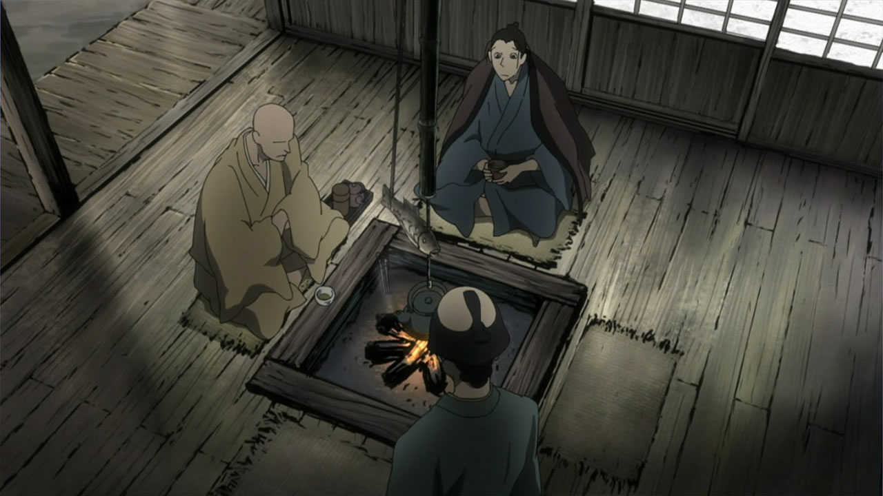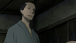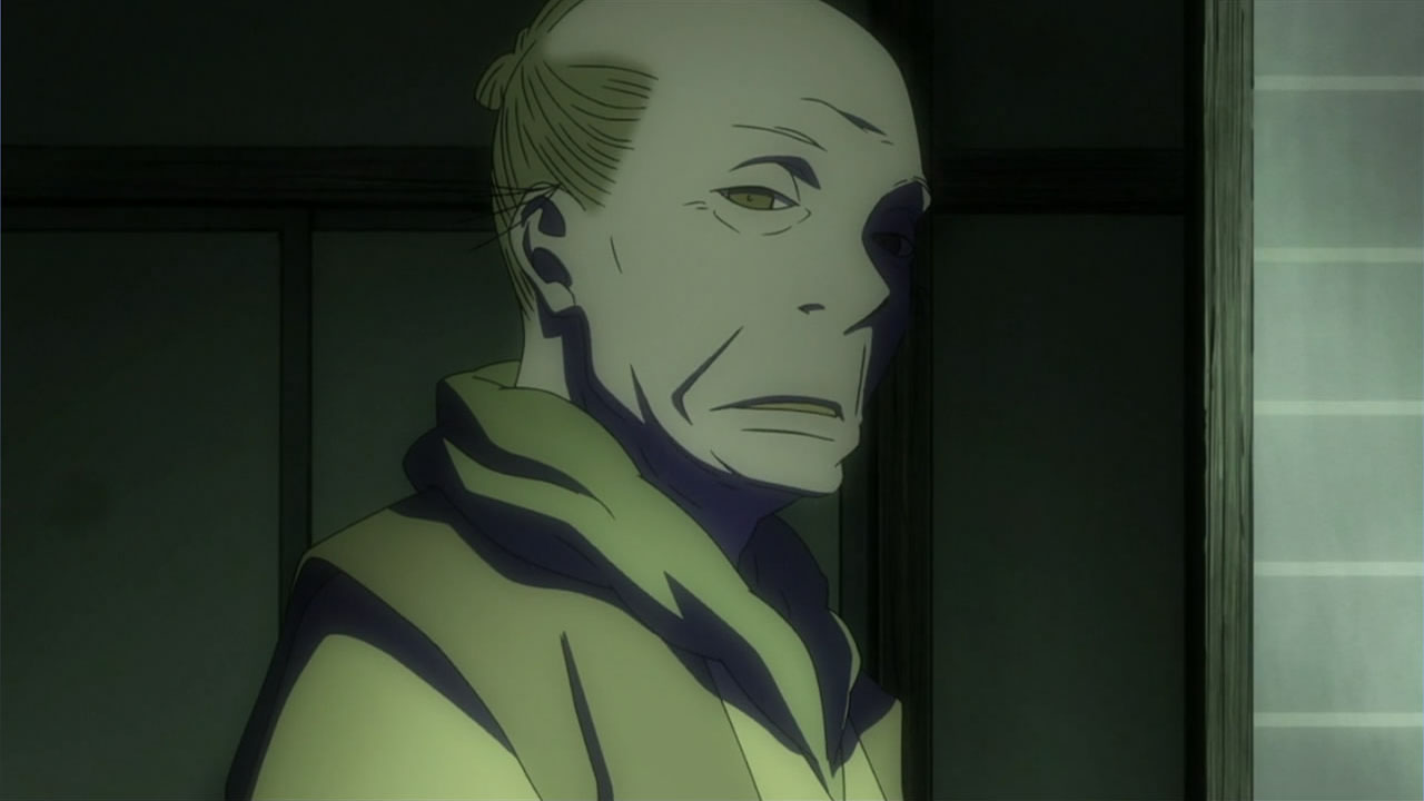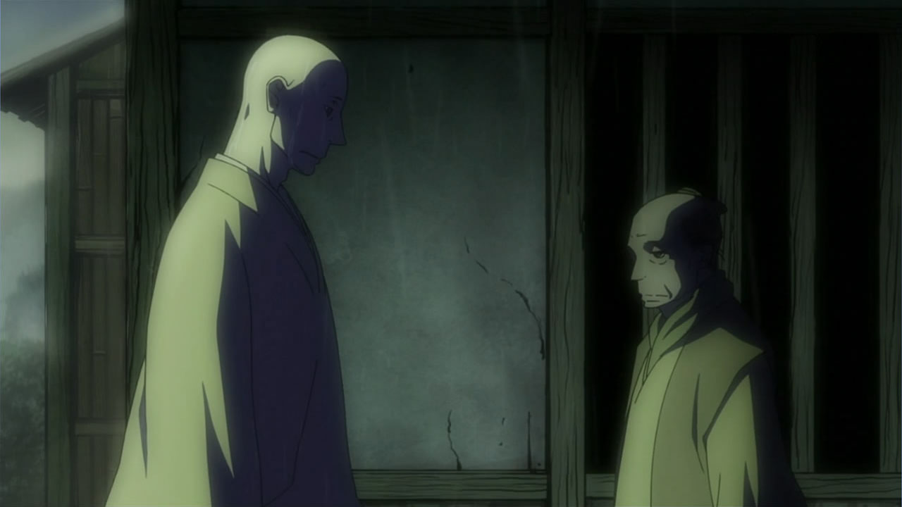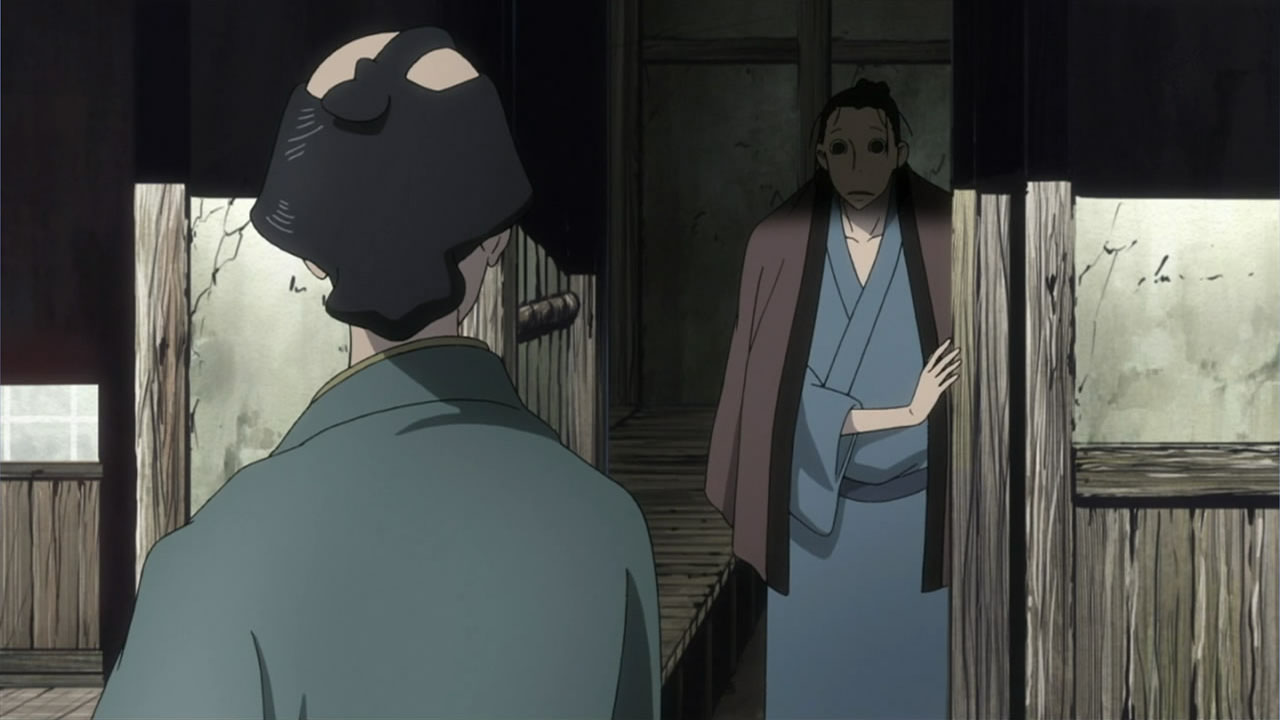This series reminds me a lot of Mushishi as well. Not just because of the obvious similarity between the lead characters, but because of the similarity in the pacing, backgrounds and architecture. It’s kind of a shame that we remain in a few recurring settings because the art style lends itself to portraying the wilderness and other environments. Unlike Mushishi, this series seems to be a bit greyed out; even in non-flashback scenes, the red hues are dimmed and dawn/dusk shots are limited.Yaichi’s flashbacks are progressing normally while the backstory of the group is moving in reverse chronological order. So they’re saving Otake’s story and the missing pieces of Yaichi’s history for the end? I like the pacing in this series, but it doesn’t lend itself to finding a suitable end point. I’m hoping they don’t plan on adding some melodrama to force Masa to join or leave, and rather let his decision come naturally.