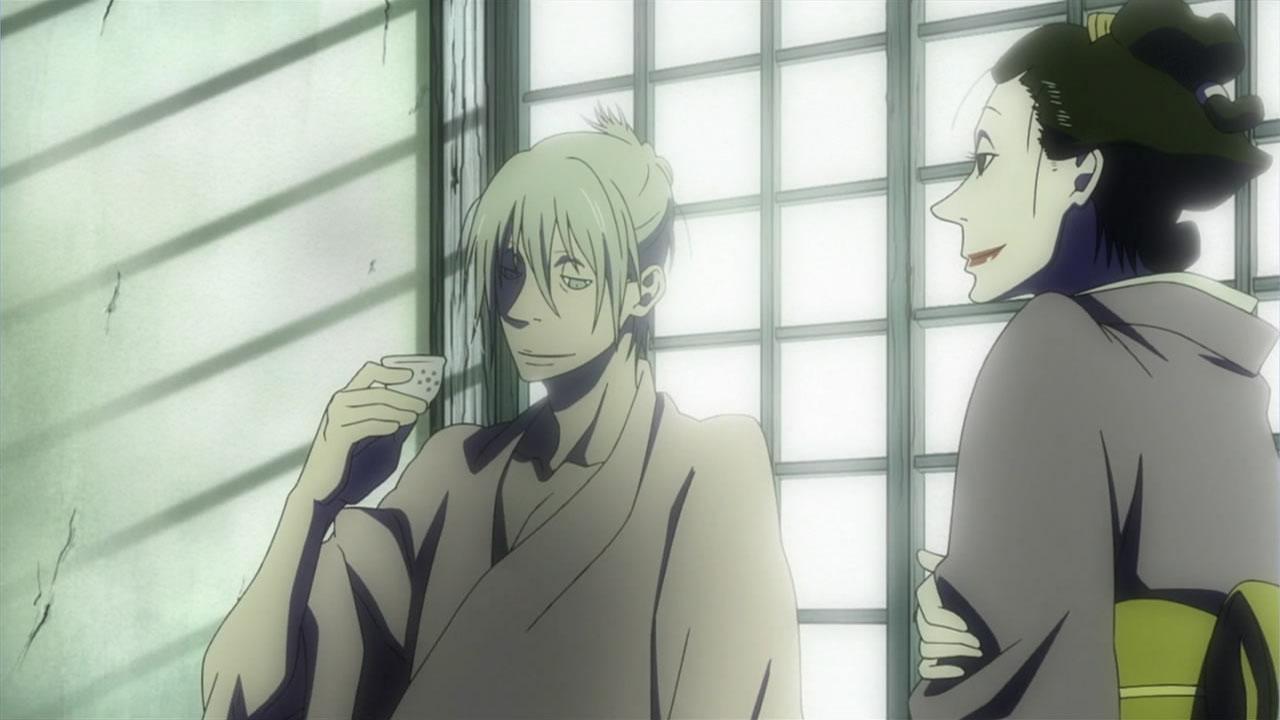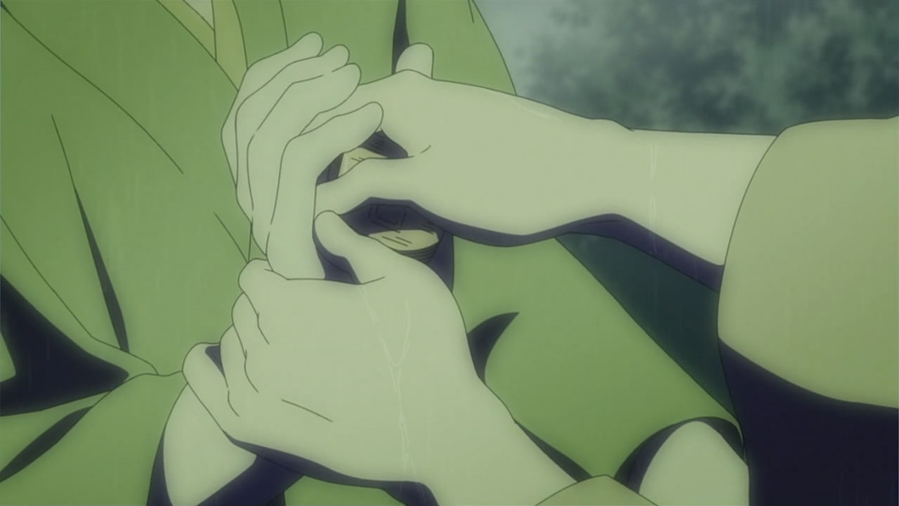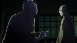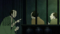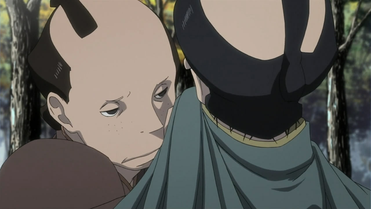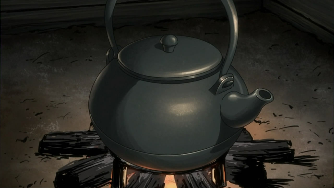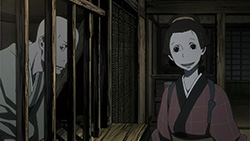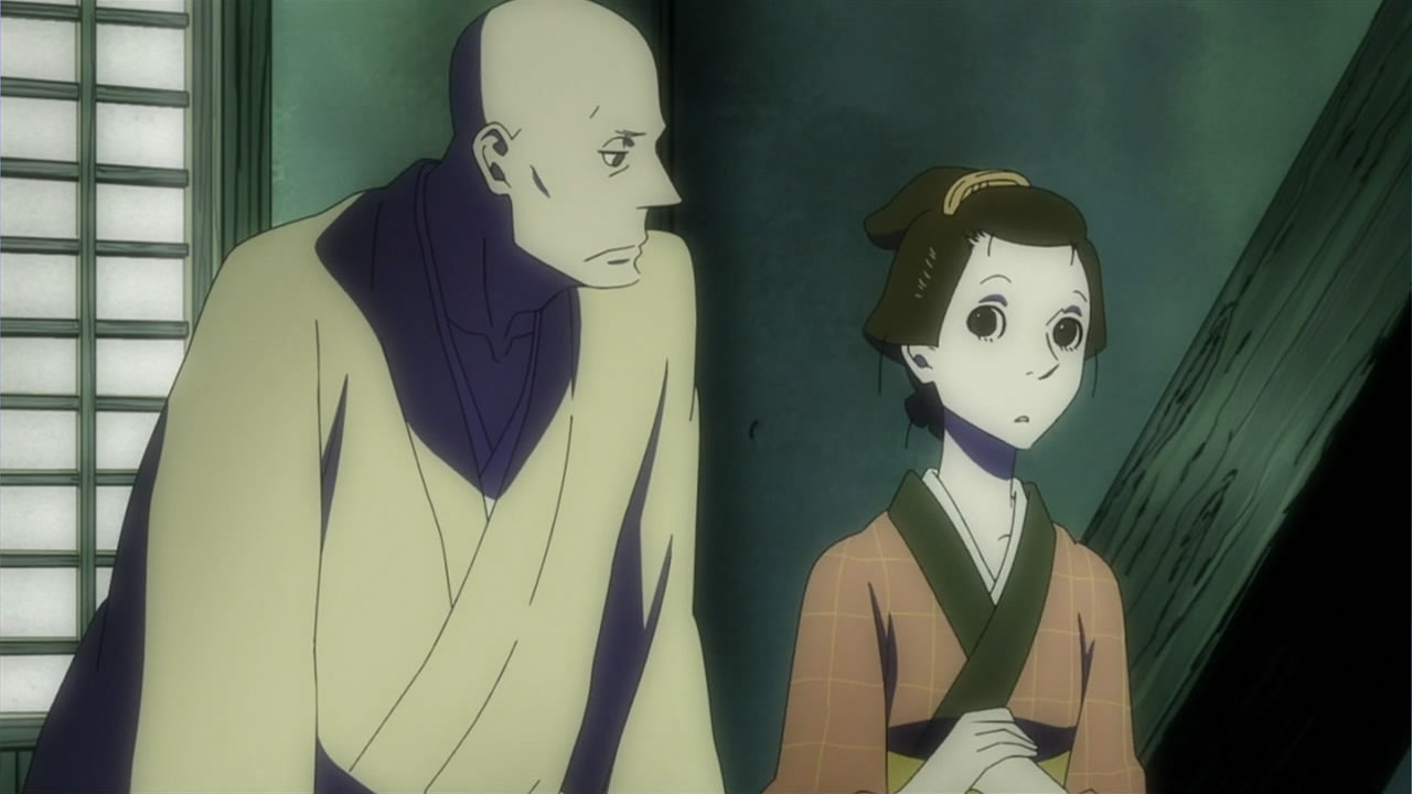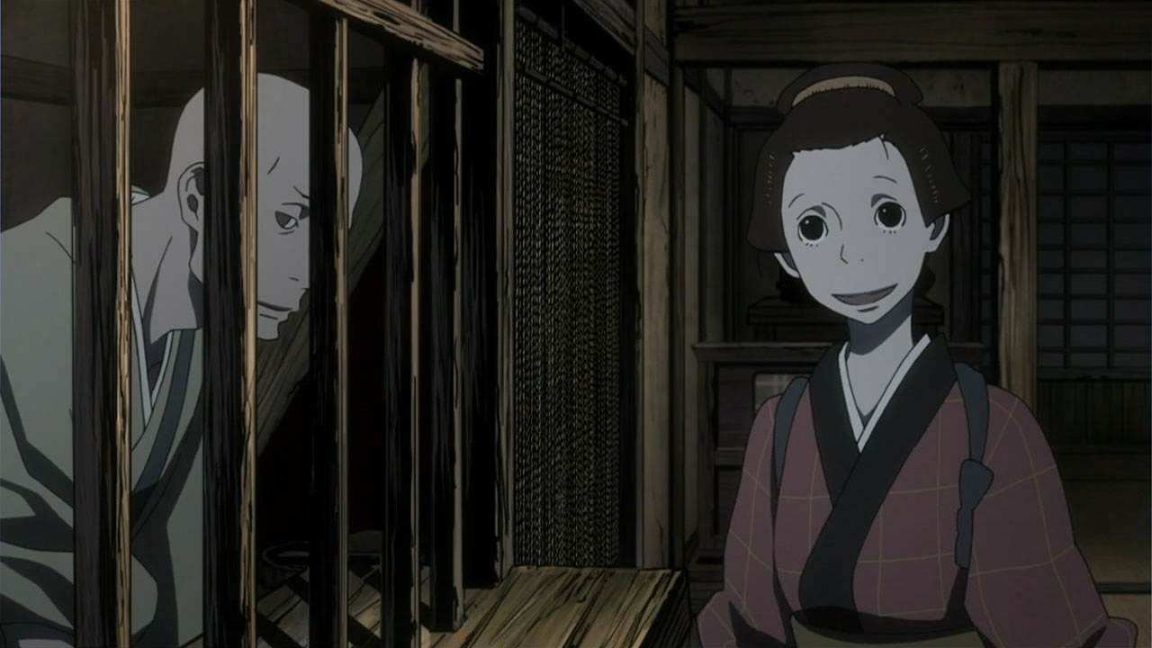 This series reminds me a lot of Mushishi as well. Not just because of the obvious similarity between the lead characters, but because of the similarity in the pacing, backgrounds and architecture. It’s kind of a shame that we remain in a few recurring settings because the art style lends itself to portraying the wilderness and other environments. Unlike Mushishi, this series seems to be a bit greyed out; even in non-flashback scenes, the red hues are dimmed and dawn/dusk shots are limited.Yaichi’s flashbacks are progressing normally while the backstory of the group is moving in reverse chronological order. So they’re saving Otake’s story and the missing pieces of Yaichi’s history for the end? I like the pacing in this series, but it doesn’t lend itself to finding a suitable end point. I’m hoping they don’t plan on adding some melodrama to force Masa to join or leave, and rather let his decision come naturally.