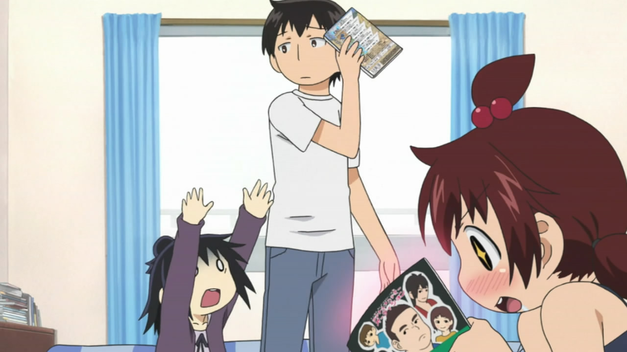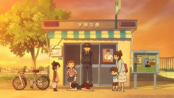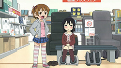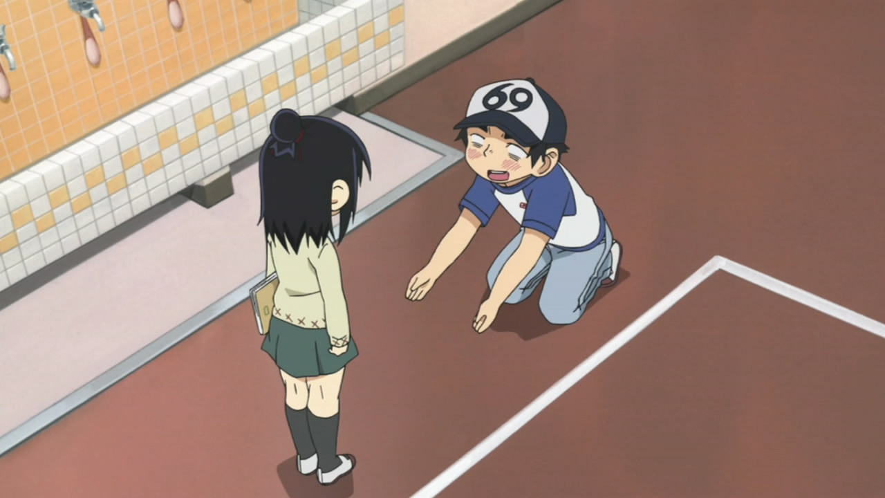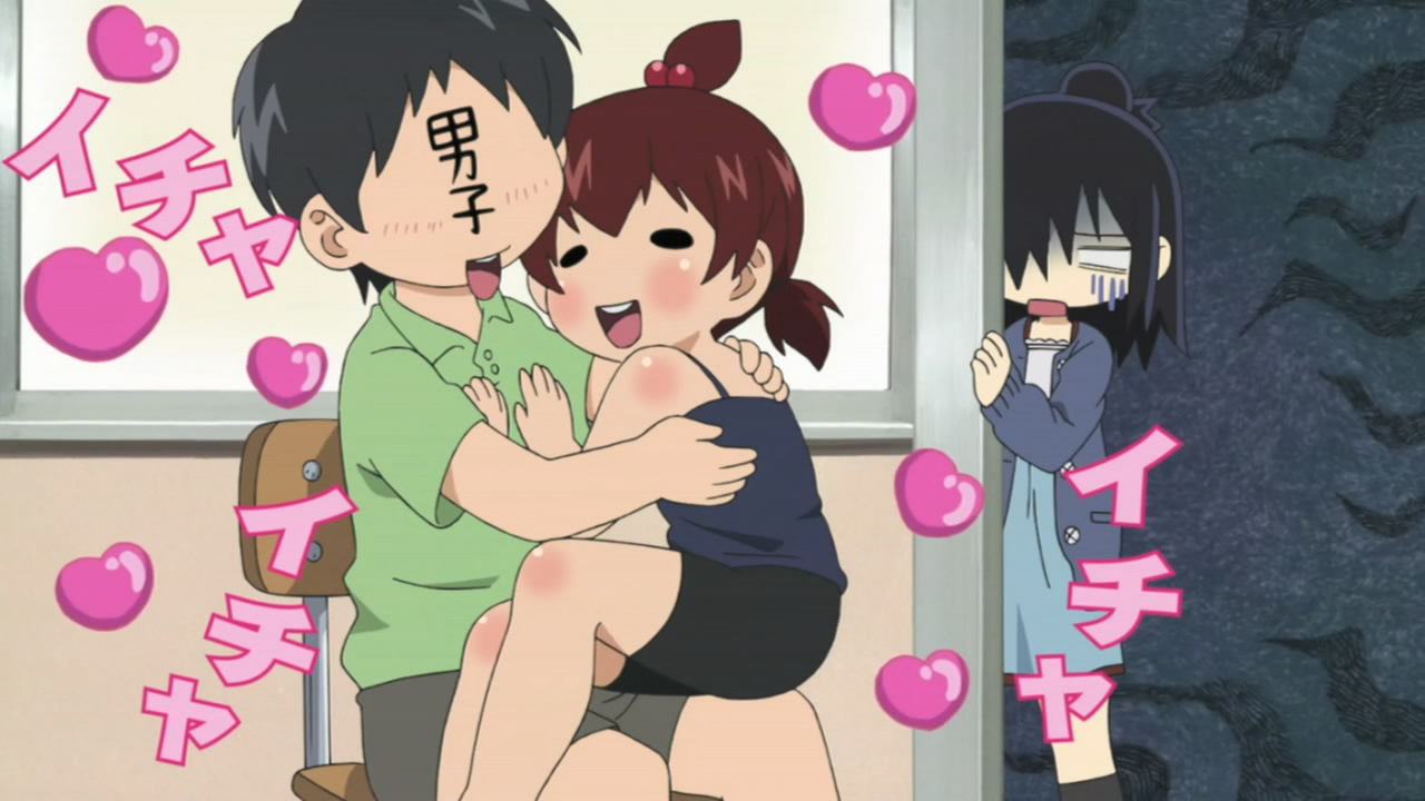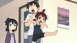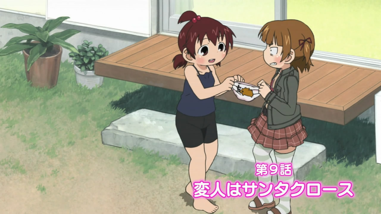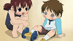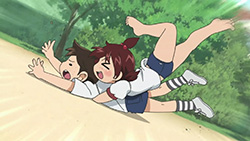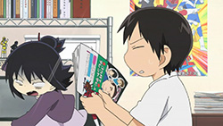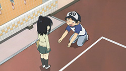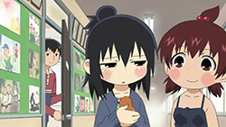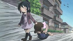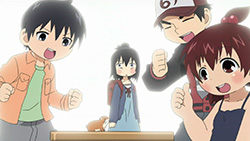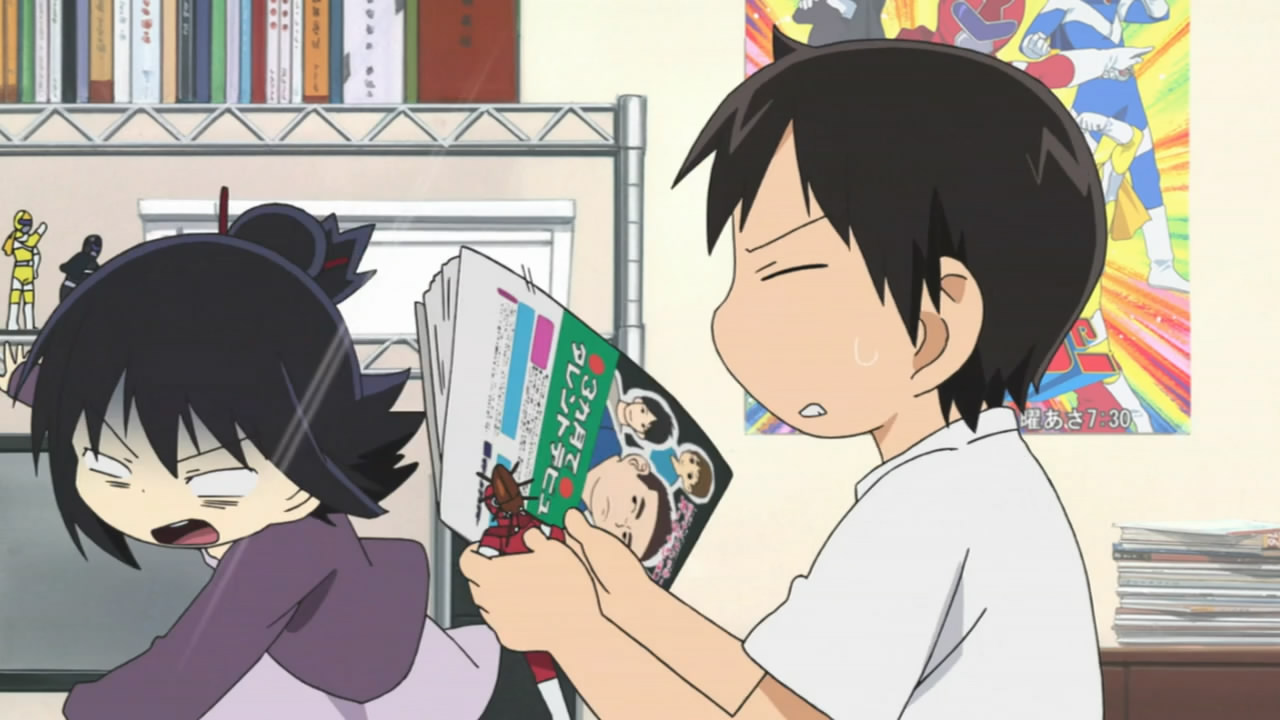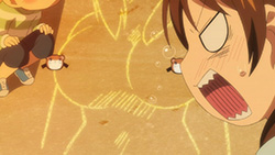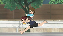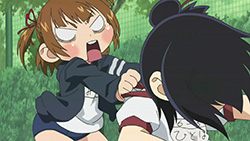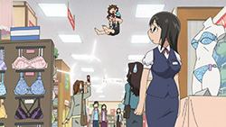 However, if I had to choose between Satoshi’s feet and a cramped apartment swarming with cockroaches, I dare say I would actually choose the former. I’m pretty impressed that Hitoha’s love for Gachi Rangers gave her enough courage to step foot into his place just for a chance to watch their DVD, because I would have refused even if someone paid me to do so. Despite the pest problem, I was still amused by the misunderstanding over Hitoha’s love for the colorful superheroes and how Satoshi thinks she’s out to belittle him as a human being for loving them. At this point, I can’t help but wonder if those two will ever see eye to eye about Gachi Rangers. While all that was going on, I wouldn’t have minded seeing more of Futaba squashing roaches with her bare hands and pinning them to the wall by throwing nails, since there seems to be no end to what our muscle girl is capable of physically. This includes going on a random run throughout town with a boy who got separated from his mother, which was apparently so epic that it warranted its own insert song about breasts. I did appreciate the change-up to a more touching note when Futaba drew a picture of the boy’s mother, but I somehow couldn’t see things ending on such a sweet note. This is Mitsudomoe after all, so Futaba’s obsession with breasts pulled through for us at the very end. Ah, all’s well that ends well.