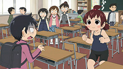 In addition to the usual four skits per episode format this series has been using, a new “Yabecchi’s Room” was added this time around. Nothing came from his interview with Mitsuba since she kept snacking on his junk food, but I get the feeling this will become a regular omake-type of thing in future episodes. Futaba or Hitoha will likely make things more interesting, especially if Gachi Rangers become the topic of discussion. There was also a skit that was completely devoid of lines as well, which provided the silent type of comedy that transcends language barriers by using actions and facial expressions that speak louder than words. The British television comedy Mr. Bean starring Rowan Atkinson came to mind when I was watching Futaba try to create her own outdoor bath and wheel a drum barrel home with Mitsuba, as the silly end result was right along the same lines. I don’t ever recall an anime trying this approach, but the slapstick humor where Mitsuba gets inadvertently abused by Futaba worked well here.