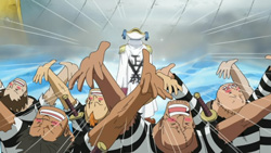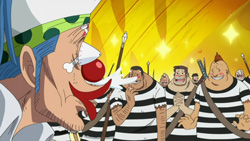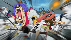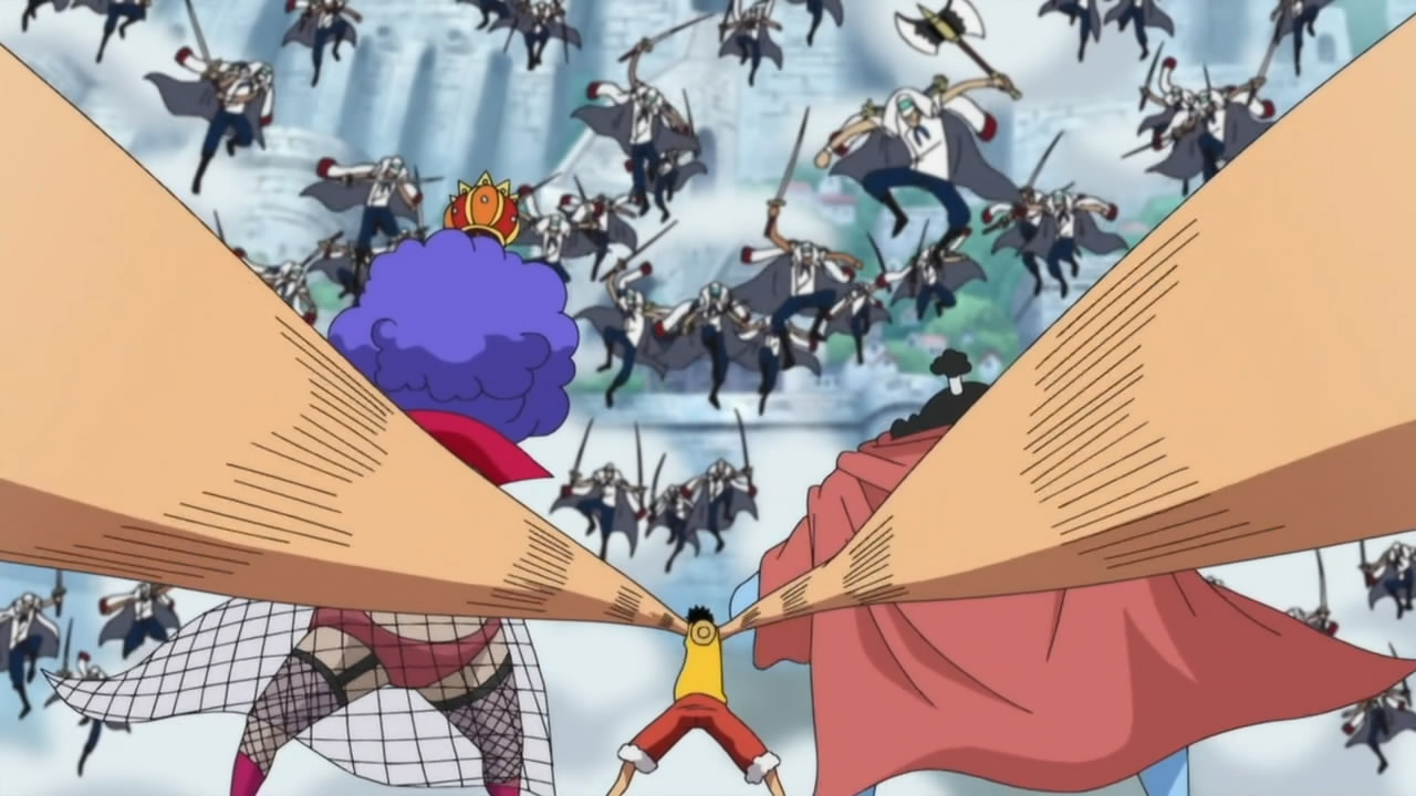 Buggy and Mr. 3’s antics, while seem like filler, were actually in the manga, and are quite hilarious. They sure got a laugh out of me, mostly due to Mr. 3’s commentary. I’ve been wondering how much more boring “war movement” scenes with fodder is left, and it seems it’s starting to finally pan out. I mean, when was the last episode where the entire episode had you sitting on the edge of your seat with drama and action? Probably Zoro vs. Kuma, I’d say. Of course you can’t always have that, but it’s been quite a while, and it should be coming up with the incoming one on one battles.