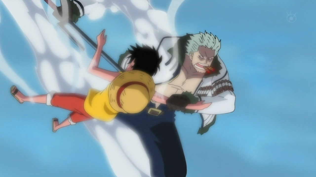 So I start up OP 468, skip past the intro, and then the recap. Imagine my face when I noticed the recap was less than a minute long compared to last week’s almost 6 minutes. So I’m thinking, oh snap, they’re really getting serious about the battles! Turns out it was still your typical episode, where most of the good animation was shoved towards the last 6 minutes. Still, color me impressed, because that Smoker fight in the air was captivating as hell (although it doesn’t look very good as screenshots). The animation was also consistent throughout, so the animation tactic wasn’t too obvious by any means.