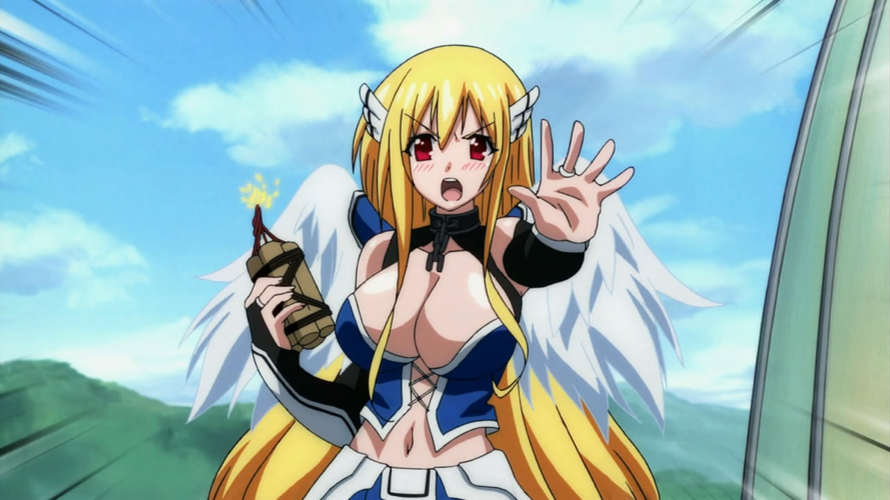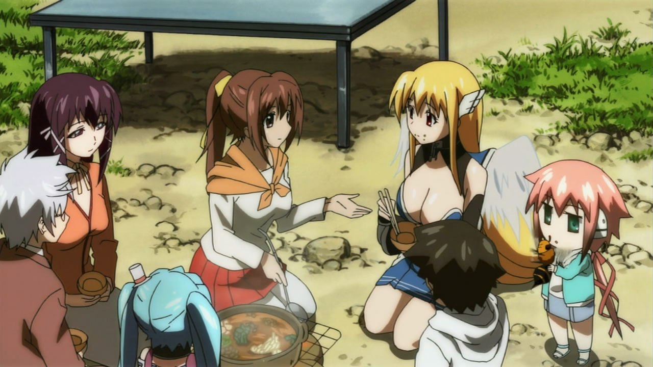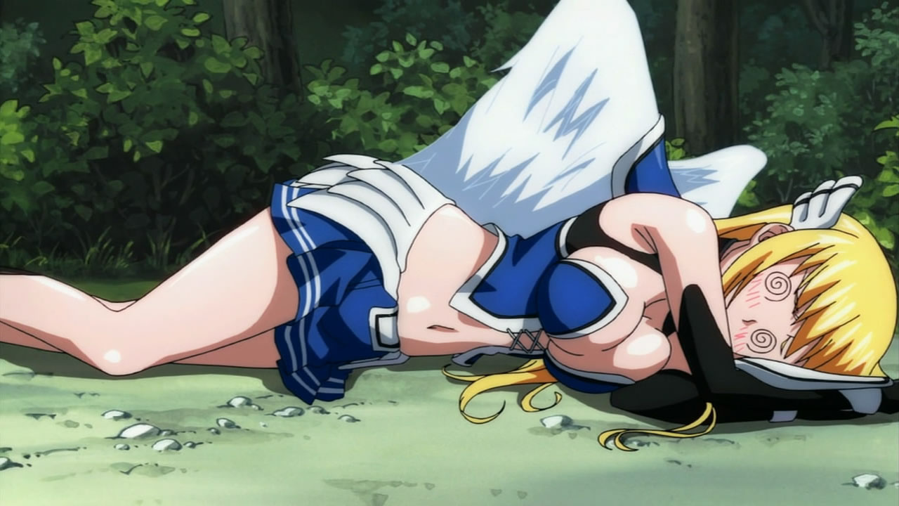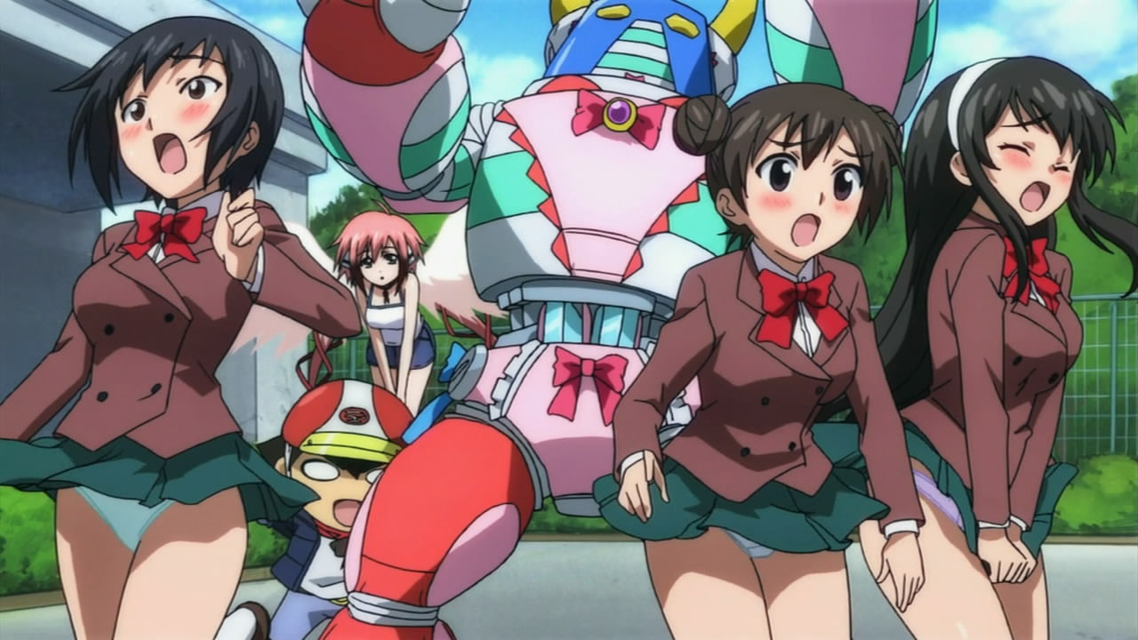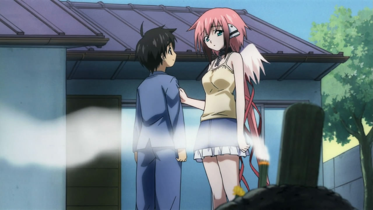 Pantsu Robo came back with ero power from the skies! He’s like Bumblebee; he’s more than meets the eye! Sadly he left us, but Tomoki buried him. Funny that “Tomoki Tower” returned for a moment, but we know that it’ll be back! I thought it was touching that Ikaros told Tomoki that she’ll always be by his side.The Borg Collective and Matrix was also what I thought of the Synapse when it was presented in all its glory to Eishirou and Sohara. Finding out that dreams are connected to the angels sleeping in Synapse and the “people” (Avatars?) on the earth was definitely surprising. I guess that particular angel that Eishirou noticed is going to be important to the plot. The Harpies seem to be the only guards there. “I Shall Return” in english from Eishirou to the Master of the Sky was unexpected, but that’s a famous line from MacArthur in WWII; Eishirou declares war! The dude can kick a brown bear’s ass, so be prepared, Master of the Sky!Nymph’s increasing her cuteness factor, sporting a new outfit every episode; I wonder if she’s shopping with Sohara nowadays (Sohara must have A LOT of outfits to wear for all the panties she has/used to have before Tomoki stole a bunch from her!). Ikaros is easily distracted, chasing butterflies and catching a giant wasp! Astrea still lovable and dumb; Getting that wasp in between the eyes looks too painful! It’s amazing how lots of serious and pervy stuff was packed in this episode! The new angeloid is creepy; it seems like the Master has lost confidence in Astraea.