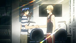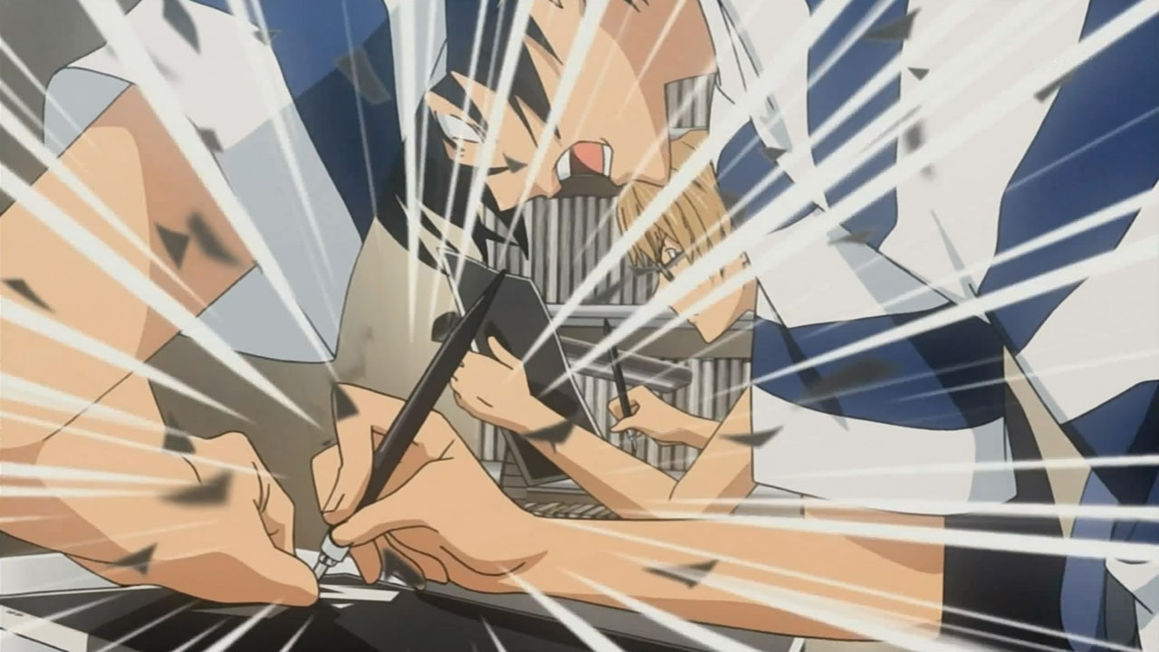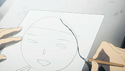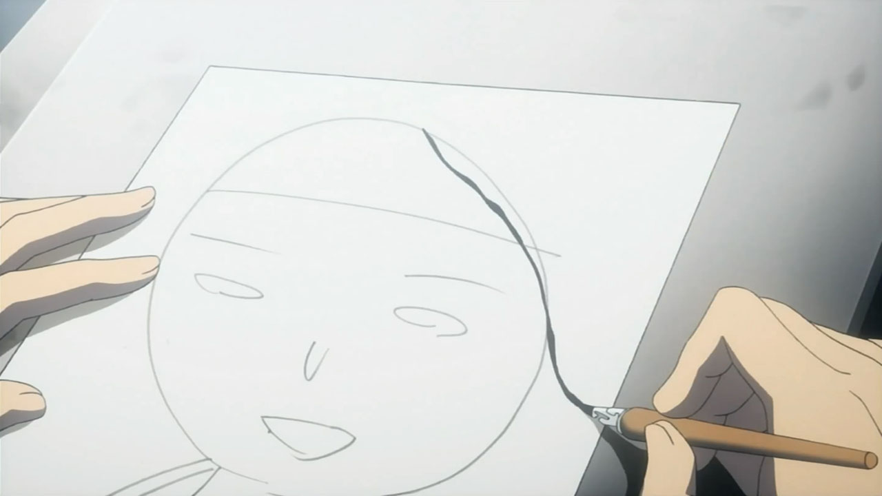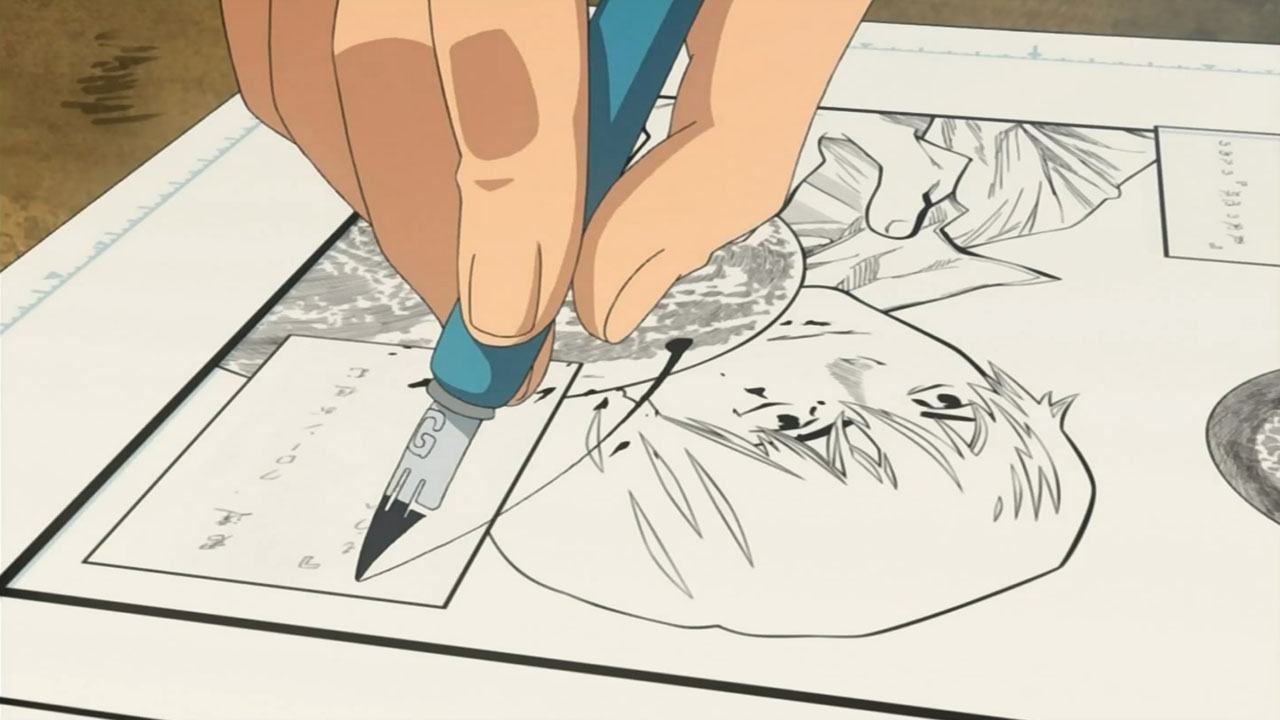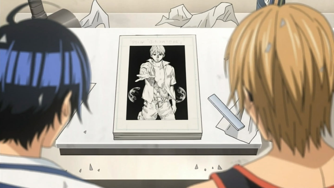 Besides the fusion dance (a sign of awesomeness) both Takagi and Moritaka bust out their skills this episode. Takagi, the man in charge of creating the “name”, actually has some pretty amazing ideas. From the two ideas he pitched, I personally thought the story of a second world was only mildly interesting. Having a second earth to fix the problems of the original one, it really makes you think about how different the world could be. But I didn’t feel the same rush of excitement Moritaka did. While Im glad they went this idea for their name, I must admit the baseball name would have been pretty funny. Gurasan Pitcher The blind pitcher who wears sunglasses! Moritaka on the other hand has set some pretty high standards for his work. In charge of actually bringing the ideas to life on paper, it was really awesome to see the different steps artwork goes through before its finalized. From name, to rough sketch, clean sketch, to ink. Its pretty hard work especially when your hand ends up like that. While Takagi manages to finish his work a lot quicker then Moritaka I think its pretty thoughtful with what he decides to do with his extra time. After Moritaka decides to start art from scratch after they see their rival, Niizuma Eijis work in Shonen Jump Jack, Takagi attempts to try what Moritaka does. Seeing how he cant draw or ink worth crap, he teaches himself how to cut out the tones and has the battle scars to prove it. In the end, both Takagi and Moritaka finish their name together unsure of their work but feeling damn proud and finishing with a glorious handshake.