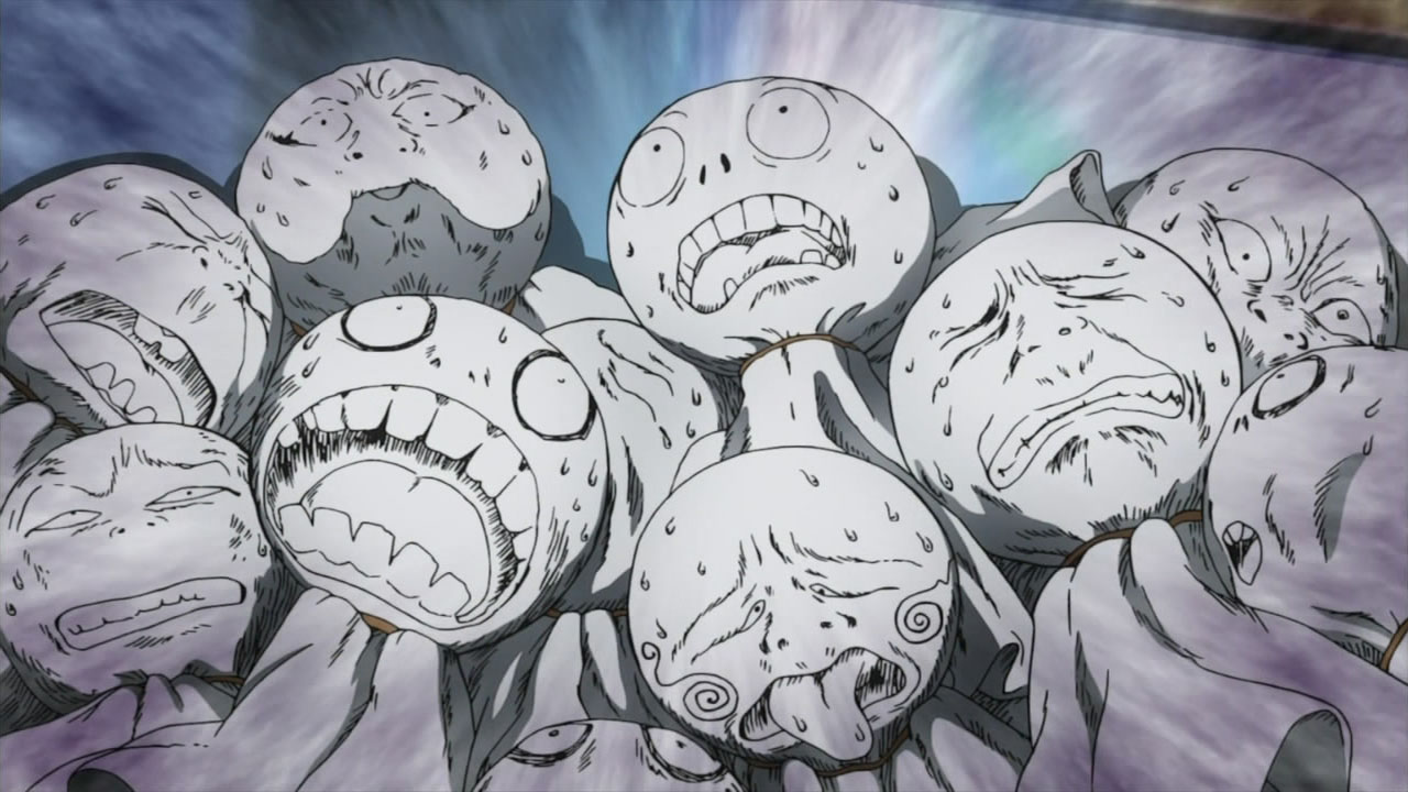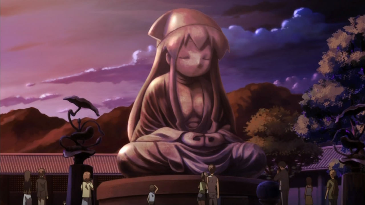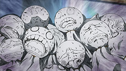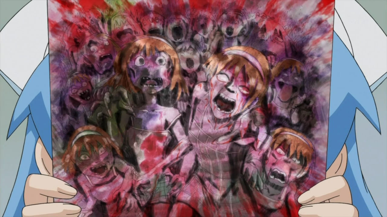 Ika may draw like a two year-old with her hands, but it’s a completely different story when her tentacles grab hold of a pencil and she churns out masterpiece after masterpiece. Best of all, her drawings were in “squid vision” and gave us an inside look at how she perceived everyone. Eiko and Chizuru’s amazement over her artistry combined with their shock from her perception of them as a killer robot and demon respectively resulted in some priceless reactions. That was nicely led into by Ika claiming that they’re complicated to draw, whereas Takeru is simple (read: plain) with no distinguishing features. Ika’s way of insulting everyone without even trying to had me amused to no end, especially with her zombie interpretation of Sanae that Eiko befittingly called “Sanae of the Dead”. And here I thought this first skit was going to be about teru teru bouzu.
