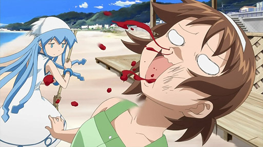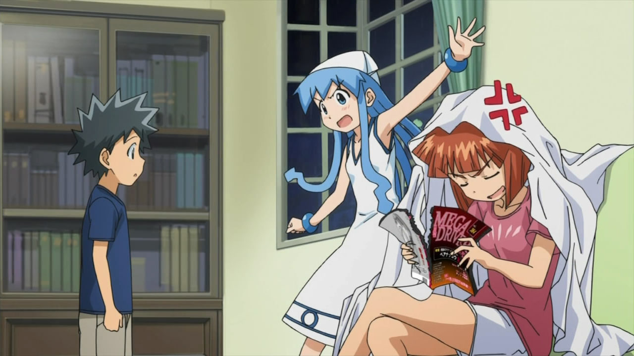 This ep was so full of win, Ika Musume shows another talents of hers, and when she thought about Takeru’s dreams being broken, it makes you think she’s not that immature. She must have lived through a lot to know to think like that, like she said during her birthday back in ep 2 or 3 she’s much older than she looks. Sanae ‘s breakdown, oh god, it was so well portrayed, I felt sorry for her too, but it was also so funny, and when she started sniffing those clothes I thought she’d masturbate thinking of Ika Musume YnS style lol. And when she started hallucinating and all, it even made me start thinking about things like Higurashi.That baseball match was so typic of anime, I loved it. And it remembered me of a DBZ scene, when Gohan was at high school playing baseball, he did the exact same thing, jumping several meters to catch the ball, without thinking about people seeing him.It was so funny. I even wonder if it wasn’t’ a reference, the scene being identical.Speaking of which there was a video game reference to Bare Knuckle/Streets of Rage btw, and it put a really big smile on my face, I played it when I was a kid and I keep playing this game with my family even after all these years. Escpecially the second one, it’s one of the best Beat Them Up ever.